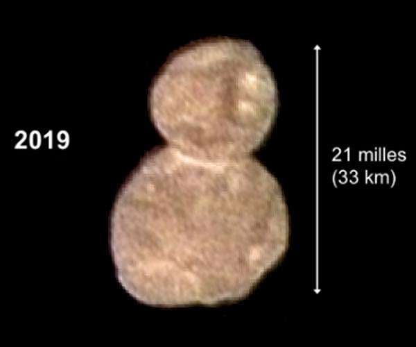 Scientists from NASA's New Horizons mission released the first detailed images of the most distant object ever explored - the Kuiper Belt object nicknamed Ultima Thule. Its remarkable appearance, unlike anything we've seen before, illuminates the processes that built the planets four and a half billion years ago. "This flyby is a historic achievement," said New Horizons principal investigator Alan Stern of the Southwest Research Institute in Boulder, Colorado. "Never before has any spacecraft team tracked down such a small body at such high speed so far away in the abyss of space. New Horizons has set a new bar for state-of-the-art spacecraft navigation." The new images - taken from as close as 17,000 miles (27,000 kilometers) on approach - revealed Ultima Thule as a "contact binary," consisting of two connected spheres. End to end, the world measures 19 miles (31 kilometers) in length. The team has dubbed the larger sphere "Ultima" (12 miles/19 kilometers across) and the smaller sphere "Thule" (9 miles/14 kilometers across). The team says that the two spheres likely joined as early as 99 percent of the way back to the formation of the solar system, colliding no faster than two cars in a fender-bender. "New Horizons is like a time machine, taking us back to the birth of the solar system. We are seeing a physical representation of the beginning of planetary formation, frozen in time," said Jeff Moore, New Horizons Geology and Geophysics team lead. "Studying Ultima Thule is helping us understand how planets form - both those in our own solar system and those orbiting other stars in our galaxy." Data from the New Year's Day flyby will continue to arrive over the next weeks and months, with much higher resolution images yet to come. "In the coming months, New Horizons will transmit dozens of data sets to Earth, and we'll write new chapters in the story of Ultima Thule - and the solar system," said Helene Winters, New Horizons project manager.