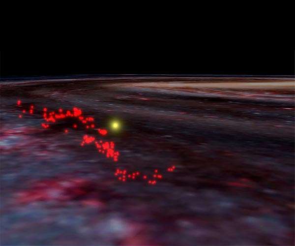 Astronomers at Harvard University have discovered a monolithic, wave-shaped gaseous structure - the largest ever seen in our galaxy - made up of interconnected stellar nurseries. Dubbed the "Radcliffe Wave" in honor of the collaboration's home base, the Radcliffe Institute for Advanced Study, the discovery transforms a 150-year-old vision of nearby stellar nurseries as an expanding ring into one featuring an undulating, star-forming filament that reaches trillions of miles above and below the galactic disk. The work, published in Nature, was enabled by a new analysis of data from the European Space Agency's Gaia spacecraft, launched in 2013 with the mission of precisely measuring the position, distance, and motion of the stars. The research team's innovative approach combined the super-accurate data from Gaia with other measurements to construct a detailed, 3D map of interstellar matter in the Milky Way, and noticed an unexpected pattern in the spiral arm closest to Earth. The researchers discovered a long, thin structure, about 9,000 light-years long and 400 light-years wide, with a wave-like shape, cresting 500 light-years above and below the mid-plane of our galaxy's disk. The Wave includes many of the stellar nurseries that were thought to form part of "Gould's Belt," a band of star-forming regions believed to be oriented in a ring around the sun. "No astronomer expected that we live next to a giant, wave-like collection of gas - or that it forms the local arm of the Milky Way," said Alyssa Goodman, the Robert Wheeler Willson Professor of Applied Astronomy, research associate at the Smithsonian Institution, and co-director of the Science Program at the Radcliffe Institute for Advanced Study. "We were completely shocked when we first realized how long and straight the Radcliffe Wave is, looking down on it from above in 3D - but how sinusoidal it is when viewed from Earth. The Wave's very existence is forcing us to rethink our understanding of the Milky Way's 3D structure." "Gould and Herschel both observed bright stars forming in an arc projected on the sky, so for a long time, people have been trying to figure out if these molecular clouds actually form a ring in 3D," said Joao Alves, a professor of physics and astronomy at the University of Vienna and 2018-2019 Radcliffe Fellow. "Instead, what we've observed is the largest coherent gas structure we know of in the galaxy, organized not in a ring but in a massive, undulating filament. The sun lies only 500 light-years from the Wave at its closest point. It's been right in front of our eyes all the time, but we couldn't see it until now." The new, 3D map shows our galactic neighborhood in a new light, giving researchers a revised view of the Milky Way and opening the door to other major discoveries. "We don't know what causes this shape, but it could be like a ripple in a pond, as if something extraordinarily massive landed in our galaxy," said Alves. "What we do know is that our sun interacts with this structure. It passed by a festival of supernovae as it crossed Orion 13 million years ago, and in another 13 million years it will cross the structure again, sort of like we are 'surfing the wave.'" Disentangling structures in the "dusty" galactic neighborhood within which we sit is a longstanding challenge in astronomy. In earlier studies, the research group of Douglas Finkbeiner, professor of astronomy and physics at Harvard, pioneered advanced statistical techniques to map the 3D distribution of dust using vast surveys of stars' colors. Armed with new data from Gaia, Harvard graduate students Catherine Zucker and Joshua Speagle recently augmented these techniques, dramatically improving astronomers' ability to measure distances to star-forming regions. That work, led by Zucker, is published in the Astrophysical Journal. "We suspected there might be larger structures that we just couldn't put in context. So, to create an accurate map of our solar neighborhood, we combined observations from space telescopes like Gaia with astrostatistics, data visualization, and numerical simulations," explained Zucker, a National Science Foundation graduate fellow and a Ph.D. candidate in the Department of Astronomy at Harvard's Graduate School of Arts and Sciences. Zucker played a key role in compiling the largest-ever catalog of accurate distances to local stellar nurseries - the basis for the 3D map used in the study. She has set herself the goal of painting a new picture of the Milky Way, near and far. "We pulled this team together so we could go beyond processing and tabulating the data to actively visualizing it - not just for ourselves but for everyone. Now, we can literally see the Milky Way with new eyes," she said. "Studying stellar births is complicated by imperfect data. We risk getting the details wrong, because if you're confused about distance, you're confused about size," said Finkbeiner. Goodman agreed, "All of the stars in the universe, including our sun, are formed in dynamic, collapsing, clouds of gas and dust. But determining how much mass the clouds have, how large they are, has been difficult, because these properties depend on how far away the cloud is." According to Goodman, scientists have been studying dense clouds of gas and dust between the stars for more than 100 years, zooming in on these regions with ever-higher resolution. Before Gaia, there was no data set expansive enough to reveal the galaxy's structure on large scales. Since its launch in 2013, the space observatory has enabled measurements of the distances to one billion stars in the Milky Way. The flood of data from Gaia served as the perfect testbed for innovative, new statistical methods that reveal the shape of local stellar nurseries and their connection to the Milky Way's galactic structure. Alves came to Radcliffe to work with Zucker and Goodman, as they anticipated the flood of data from Gaia would enhance the Finkbeiner group's "3D Dust Mapping" technolog