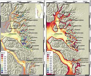 Many large glaciers in Greenland are at greater risk of melting from below than previously thought, according to new maps of the seafloor around Greenland created by an international research team. Like other recent research findings, the maps highlight the critical importance of studying the seascape under Greenland's coastal waters to better understand and predict global sea level rise. Researchers from the University of California, Irvine; NASA's Jet Propulsion Laboratory, Pasadena, California; and other research institutions combined all observations their various groups had made during shipboard surveys of the seafloors in the Uummannaq and Vaigat fjords in west Greenland between 2007 and 2014 with related data from NASA's Operation Icebridge and the NASA/U.S. Geological Survey Landsat satellites. They used the combined data to generate comprehensive maps of the ocean floor around 14 Greenland glaciers. Their findings show that previous estimates of ocean depth in this area were as much as several thousand feet too shallow. Why does this matter? Because glaciers that flow into the ocean melt not only from above, as they are warmed by sun and air, but from below, as they are warmed by water. In most of the world, a deeper seafloor would not make much difference in the rate of melting, because typically ocean water is warmer near the surface and colder below. But Greenland is exactly the opposite. Surface water down to a depth of almost a thousand feet (300 meters) comes mostly from Arctic river runoff. This thick layer of frigid, fresher water is only 33 to 34 degrees Fahrenheit (1 degree Celsius). Below it is a saltier layer of warmer ocean water. This layer is currently more than more than 5 degrees F (3 degrees C) warmer than the surface layer, and climate models predict its temperature could increase another 3.6 degrees F (2 degrees C) by the end of this century. About 90 percent of Greenland's glaciers flow into the ocean, including the newly mapped ones. In generating estimates of how fast these glaciers are likely to melt, researchers have relied on older maps of seafloor depth that show the glaciers flowing into shallow, cold seas. The new study shows that the older maps were wrong. "While we expected to find deeper fjords than previous maps showed, the differences are huge," said Eric Rignot of UCI and JPL, lead author of a paper on the research. "They are measured in hundreds of meters, even one kilometer [3,300 feet] in one place." The difference means that the glaciers actually reach deeper, warmer waters, making them more vulnerable to faster melting as the oceans warm. Coauthor Ian Fenty of JPL noted that earlier maps were based on sparse measurements mostly collected several miles offshore. Mapmakers assumed that the ocean floor sloped upward as it got nearer the coast. That's a reasonable supposition, but it's proving to be incorrect around Greenland. Rignot and Fenty are co-investigators in NASA's five-year Oceans Melting Greenland (OMG) field campaign, which is creating similar charts of the seafloor for the entire Greenland coastline. Fenty said that OMG's first mapping cruise last summer found similar results. "Almost every glacier that we visited was in waters that were far, far deeper than the maps showed." The researchers also found that besides being deeper overall, the seafloor depth is highly variable. For example, the new map revealed one pair of side-by-side glaciers whose bottom depths vary by about 1,500 feet (500 meters). "These data help us better interpret why some glaciers have reacted to ocean warming while others have not," Rignot said. The lack of detailed maps has hampered climate modelers like Fenty who are attempting to predict the melting of the glaciers and their contribution to global sea level rise. "The first time I looked at this area and saw how few data were available, I just threw my hands up," Fenty said. "If you don't know the seafloor depth, you can't do a meaningful simulation of the ocean circulation." The maps are published in a paper titled "Bathymetry data reveal glaciers vulnerable to ice-ocean interaction in Uummannaq and Vaigat glacial fjords, west Greenland," in the journal Geophysical Research Letters. The other collaborating institutions are Durham University and the University of Cambridge, both in the U.K.; GEOMAR Helmholtz Center for Ocean Research, Kiel, Germany; and the University of Texas at Austin.