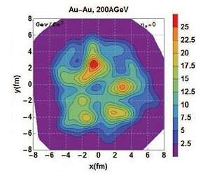 Quark-gluon plasmas are among the subjects that have been most extensively researched by physicists in recent times. Thanks to the largest particle accelerators in operation today - the Large Hadron Collider (LHC) in Europe and the Relativistic Heavy Ion Collider (RHIC) in the United States - it is now possible to reproduce a quark-gluon plasma in the laboratory. This state of matter is believed to have predominated in the universe for a fraction of a second after the Big Bang. According to the standard cosmological model, the duration of the quark-gluon plasma in the primordial universe was no more than one millionth of a second, since the universe is thought to have cooled approximately 10-6 s after the Big Bang to the extent that quarks and gluons could no longer move freely and instead became confined in hadrons (protons, neutrons, mesons, etc.). In the high-energy nuclear collisions produced at the LHC and RHIC, the quark-gluon plasmas last for an even shorter time - approximately 10-23 s - because of steep pressure gradients. Despite their transience and tiny volume (the diameter of a proton is on the order of 10-15 m), quark-gluon plasmas conceal intense and complex inner activity. This activity is gradually being unveiled in LHC and RHIC experiments, and new theoretical approaches have been developed to explain or predict their results. A case in point, among many others, is the study "Hydrodynamic predictions for mixed harmonic correlations in 200 GeV Au+Au collisions", published in Physical Review C and highlighted as an Editors' Suggestion. The study was performed by Fernando Gardim, from the Science and Technology Institute at the Federal University of Alfenas, Minas Gerais State (Southeast Brazil); Frederique Grassi and Matthew Luzum, from the Physics Institute at the University of Sao Paulo (USP); and Jacquelyn Noronha-Hostler, from the Department of Physics at the University of Houston. "Because of its very short duration, a quark-gluon plasma can't be observed directly," Grassi told. "The experiments are able to detect the hadrons formed when quarks and gluons recombine. These hadrons propagate in several directions. Their angular distribution around the axis of collision supplies highly relevant information about the plasma's structure and dynamics and, consequently, about the nature of the fundamental interactions in matter. Our study, which was theoretical, set out to predict specific patterns in the hadrons' angular distribution." The researchers used a hydrodynamic model called NeXSPheRIO, which accurately reproduced a broad range of data obtained experimentally at RHIC. The computer simulations performed on this basis enabled the researchers to make predictions that can be tested in new experiments so that the model can be validated or corrected. "The angular distribution observed in the experiments is decomposed into a sequence known in mathematics as a Fourier series," Grassi explained. "Each term in the series corresponds to a specific feature of the distribution, and the series as a whole tells us how many particles move according to each pattern. The phrase 'mixed harmonic correlations' used in the title is the technical term that names the correlations among different Fourier coefficients. "If a quark-gluon plasma were strictly homogeneous and had the properties of a gas [if its particles interacted very little], then the resulting flow of hadrons would be isotropic [equal in all directions]. But that's not the case. Actual flows detected experimentally are anisotropic, and the angular distribution exhibits non-null Fourier coefficients, which tells us that the plasma is not homogeneous and that its particles interact strongly." The distribution coefficients are classified according to their geometric characteristics as elliptic, triangular, quadrangular, pentagonal, etc. The predominant flow is elliptic, because the hadron jet is much stronger in one of the directions orthogonal to the axis of collision. This distribution, which results from the strong interaction between quarks and gluons, indicates that the plasma is not a gas but a liquid. However, it is not just any liquid: the fact that the elliptic flow is not attenuated shows that the viscosity of this liquid is extremely low. In fact, a quark-gluon plasma is the least viscous - or most perfect - liquid ever discovered. "Previous research had already shown that a quark-gluon plasma is a quasi-perfect liquid. What our study added was a better understanding of the non-homogeneity of the energy distribution inside the plasma," Grassi explained. With its very short duration and minute dimensions, a quark-gluon plasma is highly dynamic. Fluctuations cause its energy density to vary from one region to another. The study offers deeper insight into the link between these dynamics and fluctuations. "Because NeXSPheRIO has so far agreed well with all observations made to date at RHIC, we believe its predictions can be used as a basis of comparison for new measurements to be made at the US collider," Grassi said. "Any deviation from the predictions will supply valuable non-trivial information, either about the initial phase of the collision that gives rise to the plasma or about the intrinsic properties of the medium."