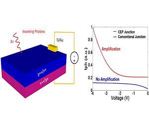 Signal amplification is ubiquitous to all electronic and optoelectronic systems for communications, imaging and computing - its characteristics directly impact device performance. A new signal amplification process discovered by a team of University of California, San Diego researchers is now poised to fuel new generations of electrical and photonic devices - transforming the fields of communications, imaging and computing. In the journal Applied Physics Letters, from AIP Publishing, the team describes their work behind this discovery. "For many years, the semiconductor industry has relied on photodetectors for optoelectrical conversion, followed by low-noise electronic amplifiers to convert optical signals into electronic signals with amplification to enable information detection and processing," explained Yu-Hwa Lo, a professor of electrical and computer engineering at the University of California, San Diego. It's also widely recognized that the highest sensitivity can be achieved by combining an electronic amplifier with a photodetector that uses an internal amplification mechanism to optimally balance out the thermal noise of the electronic amplifier and the shot noise, a type of noise in the photodetector that arises because of the particle nature of light. "Following this established principle, avalanche photodetectors that use impact ionization became the devices of choice and have remained so for many decades," Lo noted. Impact ionization, however, has drawbacks such as high operation voltage - typically 30 to 200V - and rapidly increasing noise with amplification. So the team searched for a more efficient intrinsic amplification mechanism for semiconductors to amplify the photocurrent at much lower voltage and noise than the current method. "Thanks to insights of the complex interactions among electrons in localized and extended states and phonons (a unit of vibrational energy that arises from oscillating atoms within a crystal), we've discovered a far more efficient mechanism - the cycling excitation process (CEP) - to amplify the signal," Lo said. Ready to delve into the technical concepts involved? The device primarily has a p/n junction (a boundary between two semiconductor materials within a single crystal of semiconductor) similar to those found in semiconductor devices. "The only unique feature is that both sides of the p/n junction contain a substantial amount of counter doping - a large number of donors exist in the p-region, with acceptors in the n-region," explained Lo. Such a structure is called a "heavily compensated p/n junction." Counter impurities in the compensated p/n junction are responsible for the team's highly efficient signal (photocurrent) amplification process. Electrons or holes crossing the depletion region gain kinetic energy and, in turn, excite new electron-hole pairs using the compensating impurities (donors in the p-side and acceptors in the n-side) as intermediate states. "An energetic electron, for example, can excite an electron from an occupied acceptor to the conduction band, while a phonon is absorbed subsequently to fill the acceptor with an electron from the valence band - producing a hole in the valence band to complete the generation of an electron-hole pair," said Yuchun Zhou, first author of the paper and a doctoral student in Lo's group. "This type of process occurs on both sides of the p/n junction and forms cycles of electron-hole excitation to produce high gain." The key discovery and innovation for the amplification process is to use the compensating impurities as the intermediate steps for electron-hole pair generation. "Impurity states are localized, so the conservation of momentum that limits the efficiency for conventional impact ionization can be greatly relaxed and leads to higher signal amplification efficiency and reduced operation voltage," added Lo. Most striking implication of the team's discovery? "Perhaps that an entirely new physical mechanism can be found in the most common device structure - a p/n junction - that has been used since the semiconductor industry's heyday," said Lo. "It appears that a small modification, such as heavy doping compensation, from a common structure can be used to take advantage of the unusual physical process that results from concerted interactions between electrons in extended and localized (impurity) states and phonons." With further improvements, according to the team, the discovered signal amplification mechanism can be used in a wide variety of devices and semiconductors - presenting a new paradigm for the semiconductor industry. "With an efficient gain mechanism at an operation voltage compatible with CMOS integrated circuits, it's possible to produce communication and imaging devices with superior sensitivity at a low cost," Lo pointed out. "By using other methods along with optical excitation to produce the seed carriers that initiate the cycling excitation process, we can conceive new types of transistors and circuits and extend the scope of applications beyond optical detection." "Discovery of a Photoresponse Amplification Mechanism in Compensated PN Junctions," is authored by Yuchun Zhou, Yu-Hsin Liu, Samia N. Rahman, David Hall, L.J. Sham and Yu-Hwa Lo.
