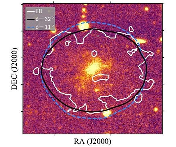 An international group of astronomers, led by a physicist at the University of St Andrews, has revived an alternative gravity theory. Headed by Dr Indranil Banik of the School of Physics and Astronomy at St Andrews, the study revealed a high predicted rotation speed of gas in a dwarf galaxy consistent with the previously debunked theory known as Milgromian Dynamics (MOND). An earlier study of the rotation speed of gas in the dwarf galaxy AGC 114905 (Mancera Pina et al, 2022) found that the gas rotated very slowly and claimed the MOND theory was dead. Such theories are essential in understanding our universe because, according to known physics, galaxies rotate so quickly they should fly apart. MOND, a controversial alternative to General Relativity, the prevailing Einstein-inspired understanding of the phenomenon of gravity that requires dark matter to hold galaxies together; does not require dark matter. As dark matter has never been detected despite decades of very sensitive searches, various theories have been put forward to explain what holds galaxies together, and debate rages over which is right. The very low rotation speed reported in the Mancera Pina et al study is inconsistent with predictions in a universe governed by General Relativity with large amounts of dark matter. Dr Banik's group argues that the high predicted rotation speed in the MOND gravity theory is consistent with observations if the inclination of the galaxy is overestimated. The rotation of stars and gas in distant galaxies cannot be measured directly. Only the component along the line of sight is known from precise spectroscopic measurements. If the galaxy is viewed almost face-on, then it would mostly rotate within the plane of the sky. This could mislead observers into thinking that the galaxy is actually rotating very slowly, which would require them to overestimate the inclination between disc and sky planes. This inclination was estimated from how elliptical the galaxy appears (see image). The new study explored this crucial issue using detailed MOND simulations of a disc galaxy similar to AGC 114905 made at the University of Bonn by Srikanth Nagesh and instigated by Pavel Kroupa, Professor at the University of Bonn and Charles University in Prague. The simulations show that it can appear somewhat elliptical even when viewed face-on. This is because stars and gas in the galaxy have gravity and can pull themselves into a somewhat non-circular shape. A similar process causes the spiral arms in disc galaxies, features which are so common that these are often called spiral galaxies. As a result, the galaxy could be a lot closer to face-on than the observers thought. This could mean the galaxy is rotating much faster than reported, removing the tension with MOND. Dr Banik, lead author on the new study, said: "Our simulations show that the inclination of AGC 114905 might be significantly less than reported, which would mean the galaxy is actually rotating much faster than people think, in line with MOND expectations." Dr Hongsheng Zhao, of the School of Physics and Astronomy at the University of St Andrews, said: "The very low reported rotation speed of this galaxy is inconsistent with both MOND and the standard approach with dark matter. But only MOND is able to get around this apparent contradiction." The new study also argues that a similar 'fake inclination' effect is unlikely to arise in the standard dark matter approach because the galaxy is dominated by the smooth dark matter halo. The stars and gas contribute little to the gravity, so the disc is not 'self-gravitating'. This means it is likely to look very circular if viewed face-on, as confirmed by simulations carried out by another group (Sellwood and Sanders, 2022). As a result, the observed ellipticity must be due to a significant inclination between the disc and sky planes. The rotation velocity would then be very small, implying that the galaxy has very little dark matter. It is not possible in this framework that an isolated dwarf galaxy would have such a small amount of dark matter given how much mass it has in stars and gas. Pavel Kroupa, Professor at the University of Bonn and Charles University in Prague, said of the broader context of these results: "While MOND works well in the tests conducted so far, the standard approach causes very severe problems on all scales ranging from dwarf galaxies like AGC 114905 all the way up to cosmological scales, as found by many independent teams."
