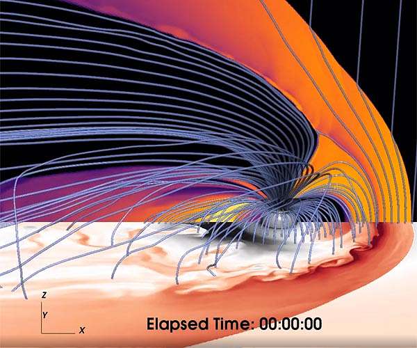 The solar wind that pummels the Earth's dayside magnetosphere causes turbulence, like air over a wing. Physicists at Rice University have developed new methods to characterize how that influences space weather on the nightside. It's rarely quiet up there. The solar wind streams around the Earth and cruises off into the night, but closer to the planet, parcels of plasma get caught in the turbulence and sink back toward Earth. That turbulence causes big ripples in the plasma. With the help of several spacecraft and computational tools developed over the past decade, Rice scientists led by space plasma physicist Frank Toffoletto can now assess the ripples, called buoyancy waves, caused by the turbulence. These waves, or oscillations, have been observed in the thin layer of magnetic flux along the base of the plasma sheet that tails away from the planet's nightside. The Rice theory is the first to quantify their motion. The theory adds another element to the Rice Convection Model [http://rocco.rice.edu/~toffo/research/rcm/rcm.html], an established, decades-in-the-making algorithm that helps scientists calculate how the inner and middle magnetosphere will react to events like solar storms that threaten satellites, communications and power grids on Earth. The new paper in JGR Space Physics by Toffoletto, emeritus professor Richard Wolf and former graduate student Aaron Schutza starts by describing the bubbles - "bursty bulk flows" predicted by Wolf and Rice alumnus Duane Pontius in 1990 - that fall back toward Earth through the plasma tail. Functionally, they're the reverse of buoyant air bubbles that bob up and down in the atmosphere because of gravity, but the plasma bubbles respond to magnetic fields instead. The plasma bubbles lose most of their momentum by the time they touch down at the theoretical, filamentlike boundary between the inner plasma sheet and the protective plasmasphere. That sets the braking boundary into a gentle oscillation, which lasts mere minutes before stabilizing again. Toffoletto compared the motion to a plucked guitar string that quickly returns to equilibrium. "The fancy name for this is the eigenmode," he said. "We're trying to figure out the low-frequency eigenmodes of the magnetosphere. They haven't been studied very much, though they appear to be associated with dynamic disruptions to the magnetosphere." Toffoletto said the Rice team has in recent years discovered through simulations that the magnetosphere doesn't always respond in a linear fashion to the steady driving force of the solar wind. "You get all kinds of wave modes in the system," he said, explaining that bursty bulk flows are one such mode. "Every time one of these things come flying in, when they hit the inner region, they basically reach their equilibrium point and oscillate with a certain frequency. Finding that frequency is what this paper is all about." As measured by the THEMIS spacecraft, the periods of these waves are a few minutes and the amplitudes are often bigger than the Earth. "Understanding the natural frequency of the system and how it behaves can tell us a lot about the physical properties of plasma on the nightside, its transport and how it might be related to the aurora," he said. "A lot of these phenomena show up in the ionosphere as auroral structures, and we don't understand where these structures come from." Toffoletto said the models suggest buoyant waves may play a role in the formation of the ring current that consists of charged particles that flow around Earth as well as magnetospheric substorms, all of which are connected to the aurora. He said that no more than a decade ago, many magnetosphere simulations "would look very uniform, kind of boring." The Rice group is collaborating with the Applied Physics Laboratory to include the Rice Convection Model in a newly developed global magnetosphere code called "Gamera" [http://civspace.jhuapl.edu/gamera], named after the fictional Japanese monster. "Now, with such higher-resolution models and much better numerical methods, these structures are starting to show up in the simulations," Toffoletto said. "This paper is one little piece of the puzzle we're putting together of how the system behaves. All this plays a big role in understanding how space weather works and how that in turn impacts technology, satellites and ground-based systems." The Rice Convection Model itself was refreshed this month in a paper led by recent Rice alumnus Jian Yang, now an associate professor of Earth and space sciences at the Southern University of Science and Technology, Shenzhen, China.