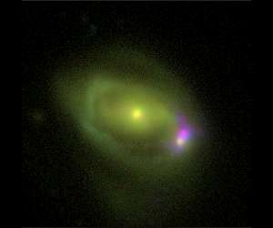 A supermassive black hole inside a tiny galaxy is challenging scientists' ideas about what happens when two galaxies become one. Was 49 is the name of a system consisting of a large disk galaxy, referred to as Was 49a, merging with a much smaller "dwarf" galaxy called Was 49b. The dwarf galaxy rotates within the larger galaxy's disk, about 26,000 light-years from its center. Thanks to NASA's Nuclear Spectroscopic Telescope Array (NuSTAR) mission, scientists have discovered that the dwarf galaxy is so luminous in high-energy X-rays, it must host a supermassive black hole much larger and more powerful than expected. "This is a completely unique system and runs contrary to what we understand of galaxy mergers," said Nathan Secrest, lead author of the study and postdoctoral fellow at the U.S. Naval Research Laboratory in Washington. Data from NuSTAR and the Sloan Digital Sky Survey suggest that the mass of the dwarf galaxy's black hole is huge, compared to similarly sized galaxies, at more than 2 percent of the galaxy's own mass. "We didn't think that dwarf galaxies hosted supermassive black holes this big," Secrest said. "This black hole could be hundreds of times more massive than what we would expect for a galaxy of this size, depending on how the galaxy evolved in relation to other galaxies." The dwarf galaxy's black hole is the engine of an active galactic nucleus (AGN), a cosmic phenomenon in which extremely high-energy radiation bursts forth as a black hole devours gas and dust. This particular AGN appears to be covered by a donut-shaped structure made of gas and dust. NASA's Chandra and Swift missions were used to further characterize the X-ray emission. Normally, when two galaxies start to merge, the larger galaxy's central black hole becomes active, voraciously gobbling gas and dust, and spewing out high-energy X-rays as matter gets converted into energy. That is because, as galaxies approach each other, their gravitational interactions create a torque that funnels gas into the larger galaxy's central black hole. But in this case, the smaller galaxy hosts a more luminous AGN with a more active supermassive black hole, and the larger galaxy's central black hole is relatively quiet. An optical image of the Was 49 system, compiled using observations from the Discovery Channel Telescope in Happy Jack, Arizona, uses the same color filters as the Sloan Digital Sky Survey. Since Was 49 is so far away, these colors are optimized to separate highly-ionized gas emission, such as the pink-colored region around the feeding supermassive black hole, from normal starlight, shown in green. This allowed astronomers to more accurately determine the size of the dwarf galaxy that hosts the supermassive black hole. The pink-colored emission stands out in a new image because of the intense ionizing radiation emanating from the powerful AGN. Buried within this region of intense ionization is a faint collection of stars, believed to be part of the galaxy surrounding the enormous black hole. These striking features lie on the outskirts of the much larger spiral galaxy Was 49a, which appears greenish in the image due to the distance to the galaxy and the optical filters used. Scientists are still trying to figure out why the supermassive black hole of dwarf galaxy Was 49b is so big. It may have already been large before the merger began, or it may have grown during the very early phase of the merger. "This study is important because it may give new insight into how supermassive black holes form and grow in such systems," Secrest said. "By examining systems like this, we may find clues as to how our own galaxy's supermassive black hole formed." In several hundred million years, the black holes of the large and small galaxies will merge into one enormous beast.