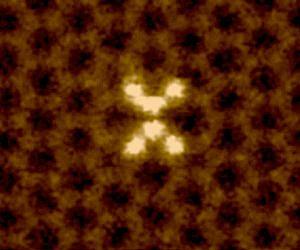 Jumping silicon atoms are the stars of an atomic scale ballet featured in a new Nature Communications study from the Department of Energy's Oak Ridge National Laboratory. The ORNL research team documented the atoms' unique behavior by first trapping groups of silicon atoms, known as clusters, in a single-atom-thick sheet of carbon called graphene. The silicon clusters, composed of six atoms, were pinned in place by pores in the graphene sheet, allowing the team to directly image the material with a scanning transmission electron microscope. The "dancing" movement of the silicon atoms, seen in a video here: http://www.ornl.gov/ornlhome/video/video_files/dancing-silicons-1.mov, was caused by the energy transferred to the material from the electron beam of the team's microscope. "It's not the first time people have seen clusters of silicon," said coauthor Juan Carlos Idrobo. "The problem is when you put an electron beam on them, you insert energy into the cluster and make the atoms move around. The difference with these results is that the change that we observed was reversible. We were able to see how the silicon cluster changes its structure back and forth by having one of its atoms 'dancing' between two different positions." Other techniques to study clusters are indirect, says Jaekwang Lee, first author on the ORNL study. "With the conventional instrumentation used to study clusters, it is not yet possible to directly identify the three-dimensional atomic structure of the cluster," Lee said. The ability to analyze the structure of small clusters is important for scientists because this insight can be used to precisely understand how different atomic configurations control a material's properties. Molecules could then be tailored for specific uses. "Capturing atomic clusters inside patterned graphene nanopores could potentially lead to practical applications in areas such as electronic and optoelectronic devices, as well as catalysis," Lee said. "It would be a new approach to tuning electronic and optical properties in materials." The ORNL team confirmed its experimental findings with theoretical calculations, which helped explain how much energy was required for the silicon atom to switch back and forth between different positions. The study, published as "Direct visualization of reversible dynamics in a Si6 cluster embedded in a graphene pore," is available online here. Coauthors are ORNL's Jaekwang Lee, Wu Zhou, Stephen Pennycook, Juan Carlos Idrobo, and Sokrates Pantelides.