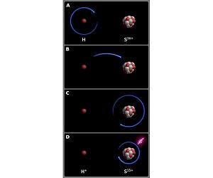 Highly Charged Ions Can Frequently Be Found Between the Galaxies According to computations done by the two researchers from SRON, Netherlands Institute for Space Research, the mysterious line could be caused by bare sulfur nuclei (S16+), i.e., sulfur atoms that have lost all their electrons, each of which picks up one electron from a hydrogen atom. Highly charged ions can often be found in the hot medium between the galaxies of a cluster, and sufficient completely ionized sulfur is present as well. "Explained in illustrative terms, the charge exchange operates like this," says Jose Crespo in explanation of the process: "The high charge of the S16+ ion sort of sucks in the electron of the H atom. It then releases energy in the form of X-rays."