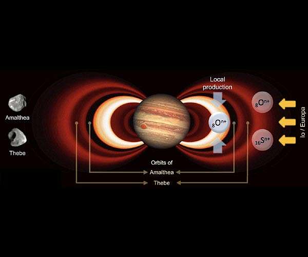 Enigmatic oxygen ions "The energy distribution of the heavy ions outside the orbit of Amalthea suggests that they are largely introduced from a more distant region of the radiations belts," Roussos says. The moon Io with its more than 400 active volcanoes, which repeatedly hurl large amounts of sulfur and sulfur dioxide into space, and to a lesser extent, Europa, are likely the main sources. Further inward, within Amalthea's orbit, the ion composition changes drastically in favor of oxygen. "The concentration and the energy of oxygen ions there is much higher than expected," Roussos says. Actually, the concentration should be decreasing in this region, as the moons Amalthea and Thebe absorb incoming ions; the two small moons' orbits thus form a kind of natural ion barrier. This behavior is, for example, known from radiation belts of the Saturnian system with its many moons. The only explanation for the increased concentration of oxygen ions is therefore another, local source in the innermost region of the radiation belts. The release of oxygen following the collisions of sulfur ions with the fine dust particles of Jupiter's rings constitute one possibility, as the researchers' computer simulations show. The rings, which are much fainter than the Saturnian ones, extend approximately as far as the orbit of Thebe. However, it is also conceivable that low-frequency electromagnetic waves in the magnetospheric environment of the innermost radiation belts heat oxygen ions to the observed energies. "Currently, it is not possible to distinguish in favor of either of these possible sources," Roussos says. ?ny of these two candidate mechanisms, nevertheless, have parallels to high energy particle production in stellar or extrasolar environments, further establishing that Jupiter's radiation belts extend into the astrophysical realm, a fact that the researcher hopes would justify their future exploration with a dedicated space mission.