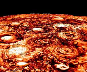 Ocean Physics Explain Cyclones on Jupiter San Diego CA (SPX) Jan 11, 2022 Hurtling around Jupiter and its 79 moons is the Juno spacecraft, a NASA-funded satellite that sends images from the largest planet in our solar system back to researchers on Earth. These photographs have given oceanographers the raw materials for a new study published in Nature Physics that describes the rich turbulence at Jupiter's poles and the physical forces that drive the large cyclones. Lead author Lia Siegelman, a physical oceanographer and postdoctoral scholar at Scripps Institution of Oce ... read more