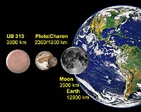 Bonn, Germany (SPX) FEB 1, 2006 German astrophysicists have measured the planetary body called UB313, that orbits beyond Pluto, and have found it is the bigger of the two. By measuring its thermal emission, the scientists were able to determine its diameter is about 3000 kilometers, or about 700 km larger than Pluto. The discovery makes it the largest solar system object found since Neptune was found in 1846. Like Pluto, UB313 constitutes another of the icy bodies orbiting in the Kuiper belt beyond Neptune. The planet also is the most distant object ever seen in the solar system, traveling in an elongated orbit that takes it out to 97 times farther from the Sun than Earth, or almost twice as far as the most distant point of Pluto's orbit. A team led by Frank Bertoldi at the University of Bonn and the Max Planck Institute for Radio Astronomy, and MPIfR's Wilhelm Altenhoff, measured the amount of heat UB313 radiates to determine its size, which when combined with the optical observations also allowed them to determine its reflectivity. "Since UB313 is decidedly larger than Pluto," Bertoldi said, "it is now increasingly hard to justify calling Pluto a planet if UB313 is not also given this status." The planet was discovered in January 2005 by astronomer Mike Brown and colleagues at the Californian Institute of Technology in Pasadena. They were conducting a sky survey using a wide field digital camera that searches for distant minor planets at visible wavelengths, and discovered a slow-moving object, whose distance and orbital shape they were able to determine. The instruments could not determine the object's size, however, although from its optical brightness they estimated it was larger than Pluto. In optically visible light, the apparent brightness of objects depends on their size as well as on surface reflectivity, which is known to vary between 4 percent for most comets to over 50 percent for Pluto, thereby rendering impossible any accurate size determinations from optical light alone. Reporting in the Feb. 2 issue of Nature, the Bonn group said it overcame this difficulty by using the IRAM 30-meter telescope in Spain, which is equipped with the sensitive Max-Planck Millimeter Bolometer (MAMBO) detector developed and built at the MPIfR, to measure specific characteristics of UB313's heat radiation that could pinpoint both its diameter and distance from the Sun. The team also discovered that UB313's surface reflects about 60 percent of incoming sunlight, which is very similar to Pluto's reflectivity. Related Links -