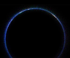 A new image from NASA's New Horizons spacecraft is the first look at Pluto's atmosphere in infrared wavelengths, and the first image of the atmosphere made with data from the New Horizons Ralph/Linear Etalon Imaging Spectral Array (LEISA) instrument. In the image, sunlight is coming from above and behind Pluto. The image was captured on July 14, 2015, while New Horizons was about 112,000 miles (180,000 kilometers) away. The image covers LEISA's full spectral range (1.25 to 2.5 microns), which is divided into thirds, with the shortest third being put into the blue channel, middle third into the green channel, and longest into the red channel. North in this image is around the 10 o'clock position. The blue ring around Pluto is caused by sunlight scattering from haze particles common in Pluto's atmosphere; scientists believe the haze is a photochemical smog resulting from the action of sunlight on methane and other molecules, producing a complex mixture of hydrocarbons such as acetylene and ethylene. These hydrocarbons accumulate into small particles - a fraction of a micrometer in size - which scatter sunlight to make the blue haze. The new infrared image, when combined with earlier images made at shorter, visible wavelengths, gives scientists new clues into the size distribution of the particles. The whitish patches around Pluto's limb in this image are sunlight bouncing off more reflective or smoother areas on Pluto's surface - with the largest patch being the western section of the informally named Cthulhu Regio. Future LEISA observations returned to Earth should capture the remainder of the haze, missing from the lower section of the image.