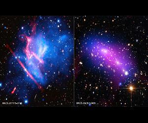 ACS J0416 In MACS J0416 the dark matter (which leaves its gravitational imprint in the optical data) and the hot gas (detected by Chandra) line up well with each other. This suggests that the clusters have been caught before colliding. If the clusters were being observed after colliding, the dark matter and hot gas should separate from each other, as seen in the famous colliding cluster system known as the Bullet Cluster. The cluster in the upper left contains a compact core of hot gas, most easily seen in a specially processed image, and also shows evidence of a nearby cavity, or hole, in the X-ray emitting gas. The presence of these structures also suggests that a major collision has not occurred recently; otherwise these features would likely have been disrupted. Finally, the lack of sharp structures in the radio image provides more evidence that a collision has not yet occurred. In the cluster located in the lower right, the observers have noted a sharp change in density on the southern edge of the cluster. This change in density is most likely caused by a collision between this cluster and a less massive structure located further to the lower right.
