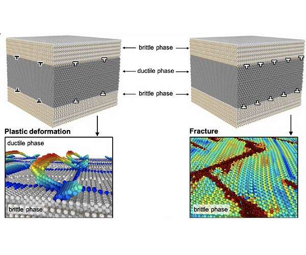 Pearlitic steel, or pearlite, is one of the strongest materials in the world and can be made into thin and long wires. The strength of pearlite allows it to sustain very heavy weight, however what makes it special is its ability to stretch and contract without breaking (ductility). Ductility is important for building bridges, as even if a material is strong enough to support heavy weight, it can break when subjected to stretching if it is not ductile enough. This is why structures made of concrete can still collapse during violent earthquakes. Pearlite is used for suspension bridges to help them withstand strong shaking while supporting heavy weight. Pearlite is made of alternating nanolayers of cementite and ferrite. The cementite helps make it strong, while the ferrite helps make it ductile. However, until now researchers did not know exactly how the two worked together to give pearlite its special quality, or better yet, how to control their working together to engineer an even better material. Researchers at Kanazawa University have discovered that disruptions, or dislocations, in the arrangement of atoms along the interface between a cementite and a ferrite layer protect the cementite from fracturing under stretching or compression. Their study was published last month in the journal Acta Materialia. "The spacing between dislocations on a cementite-ferrite interface determines how deformation travels through the nanolayers", the authors say. "Manipulating the dislocation structure and the distance between dislocations can control the ductility of pearlite." The researchers used computer simulations to see how a pearlite wire would deform with dislocations of different orientations and different distances between them along the ferrite-cementite interface. They found that particular dislocation structures and distances could stop cracks from forming or spreading throughout the cementite layer. "Increasing the ductility of pearlite means it can resist more shearing stress without breaking or tearing," say the authors. This may lead to a new generation of materials for constructing buildings and bridges that can withstand stronger earthquakes. The researchers believe manipulating dislocations consisting of entire clusters of atoms could be a general technique for enhancing not only ductility but other properties of materials to meet particular engineering and construction needs.