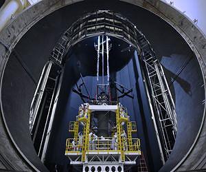 Looking out from inside the enormous mouth of NASA's giant thermal vacuum chamber, called Chamber A, located at NASA's Johnson Space Center in Houston, the Pathfinder or test model of the James Webb Space Telescope's backplane is seen sliding in on the rails. Previously used for manned spaceflight missions, this historic chamber is now being readied for a cryogenic test. "After over a decade of planning, it is gratifying to see everything coming together so smoothly," said Lee Feinberg, NASA Optical Telescope Element Manager. Prior to this shot, the entire Pathfinder was manually deployed, lifted and installed on a cart. "This is a huge milestone. There were three organizations working together to make this happen," said John Amon, Manufacturing Engineer for Exelis Rochester, New York, "NASA, Northrop Grumman and Exelis had a strong collaboration. This move is really moving the Pathfinder testing forward." Once the cart was ready the Pathfinder traveled down the rails into the chamber. This is the Pathfinder's fit check, the first time it has entered the chamber. Afterwards, Pathfinder was taken out and the next time it returns into the chamber the giant door will be closed and the cryogenic test is readied.