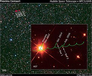 NASA's Hubble Space Telescope will have two opportunities in the next few years to hunt for Earth-sized planets around the red dwarf Proxima Centauri. The opportunities will occur in October 2014 and February 2016 when Proxima Centauri, the star nearest to our sun, passes in front of two other stars. Astronomers plotted Proxima Centauri's precise path in the heavens and predicted the two close encounters using data from Hubble. "Proxima Centauri's trajectory offers a most interesting opportunity because of its extremely close passage to the two stars," said Kailash Sahu, an astronomer with the Space Science Telescope Institute in Baltimore, Md. Sahu leads a team of scientists whose work he presented Monday at the 222nd meeting of American Astronomical Society in Indianapolis. Red dwarfs are the most common class of stars in our Milky Way galaxy. Any such star ever born is still shining today. There are about 10 red dwarfs for every star like our sun. Red dwarfs are less massive than other stars. Because lower-mass stars tend to have smaller planets, red dwarfs are ideal places to go hunting for Earth-sized planets. Previous attempts to detect planets around Proxima Centauri have not been successful. But astronomers believe they may be able to detect smaller terrestrial planets, if they exist, by looking for microlensing effects during the two rare stellar alignments. Microlensing occurs when a foreground star passes close to our line of sight to a more distant background star. These images of the background star may be distorted, brightened and multiplied depending on the alignment between the foreground lens and the background source. These microlensing events, ranging from a few hours to a few days in duration, will enable astronomers to measure precisely the mass of this isolated red dwarf. Getting a precise determination of mass is critical to understanding a star's temperature, diameter, intrinsic brightness, and longevity. Astronomers will measure the mass by examining images of each of the background stars to see how far the stars are offset from their real positions in the sky. The offsets are the result of Proxima Centauri's gravitational field warping space. The degree of offset can be used to measure Proxima Centauri's mass. The greater the offset, the greater the mass of Proxima Centauri. If the red dwarf has any planets, their gravitational fields will produce a second small position shift. Because Proxima Centauri is so close to Earth, the area of sky warped by its gravitation field is larger than for more distant stars. This makes it easier to look for shifts in apparent stellar position caused by this effect. However, the position shifts will be too small to be perceived by any but the most sensitive telescopes in space and on the ground. The European Space Agency's Gaia space telescope and the European Southern Observatory's Very Large Telescope on Mt. Cerro Paranal in Chile may be able to make measurements comparable to Hubble's. To identify possible alignment events, Sahu's team searched a catalog of 5,000 stars with a high rate of angular motion across the sky and singled out Proxima Centauri. It crosses a section of sky with the apparent width of the full moon as observed from Earth every 600 years.