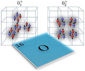 Oxygen-16, one of the key elements of life on earth, is produced by a series of reactions inside of red giant stars. Now a team of physicists, including one from North Carolina State University, has revealed how the element's nuclear shape changes depending on its state, even though other attributes such as spin and parity don't appear to differ. Their findings may shed light on how oxygen is produced. Carbon and oxygen are formed when helium burns inside of red giant stars. Carbon-12 forms when three helium-4 nuclei combine in a very specific way (called the triple alpha process), and oxygen-16 is the combination of a carbon-12 and another helium-4 nucleus. Although physicists knew what oxygen-16 was made of, they were still puzzled by the fact that both the ground and first excited states of the element had zero spin and positive parity. A similar situation occurs in carbon-12 with the ground state and second zero-spin state known as the Hoyle state. At room temperature, only the ground state of oxygen-16 is seen due to the very cold temperature compared to nuclear energies. But the excited states of oxygen-16 become important for the helium-burning reactions inside stars. "It's expected that oxygen-16 would have zero spin and positive parity as its ground state," says NC State physicist Dean Lee, team member and co-author of a paper describing the research. "What is unexpected is that the first excited state also has these qualities. It made us wonder what the real difference is between the states, which required looking at the structure of the eight protons and eight neutrons in oxygen-16. We had addressed a similar puzzle for the ground state and Hoyle state of carbon-12." Lee, with colleagues Evgeny Epelbaum, Hermann Krebs, Timo Laehde, and Ulf-G. Meissner, had previously developed a new method for describing all the possible ways that protons and neutrons can bind with one another inside nuclei such as carbon-12 and the Hoyle state. They used an approach called "effective field theory" formulated on a complex numerical lattice that allows the researchers to run simulations that show how particles interact, and so reveal the structure of the nuclei. In this work, the same team plus Mississippi State physicist Gautam Rupak, found their lattice revealed that although both the ground and first excited states of oxygen-16 "look" the same in terms of spin and parity, they are in fact quite different structurally. In the ground state, the protons and neutrons are arranged in a tetrahedral configuration of four alpha clusters containing two protons and two neutrons each. For the first excited state, the alpha clusters are arranged in a square. "The production of oxygen-16 from carbon-12 is still very poorly understood from both theoretical and experimental studies," Lee says. "These lattice simulations give us our first look at the structure of low-energy states of oxygen-16." The results appear online March 12 in Physical Review Letters. The work was funded by the U.S. Department of Energy; the National Science Foundation; the Deutsche Forschungsgemeinschaft, Helmholtz-Gemeinschaft Deutscher Forschungszentren and Bundesministerium fuer Bildung und Forschung in Germany; European Union HadronPhysics3 Project and the European Research Council. "Ab Initio Calculation of the Spectrum and Structure of 16O" Authors: Dean Lee, North Carolina State University; Gautam Rupak, Mississippi State University; Evgeny Epelbaum and Hermann Krebs, Institut fuer Theoretische Physik II, Ruhr-Universitaet Bochum, Germany; Timo A. Laehde, Forschungszentrum Juelich, Germany; Ulf-G. Meissner, Helmholtz-Institut fuer Strahlen-und Kernphysik and Bethe Center for Theoretical Physics, Universitaet Bonn, Germany; Published: March 12, 2014 in Physical Review Letters
