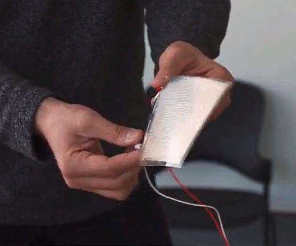 MIT engineers have developed a paper-thin loudspeaker that can turn any surface into an active audio source. This thin-film loudspeaker produces sound with minimal distortion while using a fraction of the energy required by a traditional loudspeaker. The hand-sized loudspeaker the team demonstrated, which weighs about as much as a dime, can generate high-quality sound no matter what surface the film is bonded to. To achieve these properties, the researchers pioneered a deceptively simple fabrication technique, which requires only three basic steps and can be scaled up to produce ultrathin loudspeakers large enough to cover the inside of an automobile or to wallpaper a room. Used this way, the thin-film loudspeaker could provide active noise cancellation in clamorous environments, such as an airplane cockpit, by generating sound of the same amplitude but opposite phase; the two sounds cancel each other out. The flexible device could also be used for immersive entertainment, perhaps by providing three-dimensional audio in a theater or theme park ride. And because it is lightweight and requires such a small amount of power to operate, the device is well-suited for applications on smart devices where battery life is limited. "It feels remarkable to take what looks like a slender sheet of paper, attach two clips to it, plug it into the headphone port of your computer, and start hearing sounds emanating from it. It can be used anywhere. One just needs a smidgeon of electrical power to run it," says Vladimir Bulovic, the Fariborz Maseeh Chair in Emerging Technology, leader of the Organic and Nanostructured Electronics Laboratory (ONE Lab), director of MIT.nano, and senior author of the paper. Bulovic wrote the paper with lead author Jinchi Han, a ONE Lab postdoc, and co-senior author Jeffrey Lang, the Vitesse Professor of Electrical Engineering. The research is published in IEEE Transactions of Industrial Electronics.
