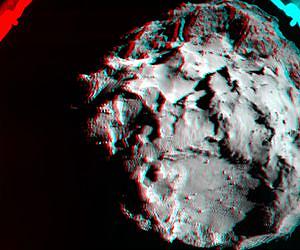 A 3D image shows what it would look like to fly over the surface of comet 67P/Churyumov-Gerasimenko. The image was generated from data collected by the Rosetta Lander Imaging System (ROLIS) aboard the European Space Agency's Philae spacecraft during the descent to the spacecraft's initial touchdown on the comet Nov. 12. The European Space Agency also released an audio track of the first of the lander's three touchdowns on the surface of the comet. The stereographic image was generated using two images acquired by ROLIS when Philae was a little less than 2 miles (3 kilometers) from the surface. The images were taken two minutes apart - about one hour prior to the spacecraft's initial touchdown on 67P at 8:03 a.m. PST (11:03 a.m. EST). In the image, the landing site Agilkia can be seen immediately below. In the top right of the field of view, one of the landing gear feet can be seen. The resolution is about 10 feet (3 meters) per pixel. To appreciate the 3D effect, the image must be viewed with red-blue glasses. At the time Philae made its first touchdown on the comet, a short but significant "thud" was heard by Philae's Cometary Acoustic Surface Sounding Experiment (CASSE) as the spacecraft made its first touchdown. The two-second recording from space is the very first of the contact between a man-made object with a comet upon landing. The CASSE sensors are located in the feet at the base of all three legs of the lander. "The Philae lander came into contact with a soft layer several centimeters thick," said Klaus Seidensticker, lead scientist for the CASSE instrument from the German Aerospace Center's Institute of Planetary Research, Berlin. "Then, just milliseconds later, the feet encountered a hard, perhaps icy layer on 67P/Churyumov-Gerasimenko." Comets are time capsules containing primitive material left over from the epoch when our sun and its planets formed. Rosetta will be the first spacecraft to witness at close proximity how a comet changes as it is subjected to the increasing intensity of the sun's radiation. Observations will help scientists learn more about the origin and evolution of our solar system and the role comets may have played in seeding Earth with water, and perhaps even life.