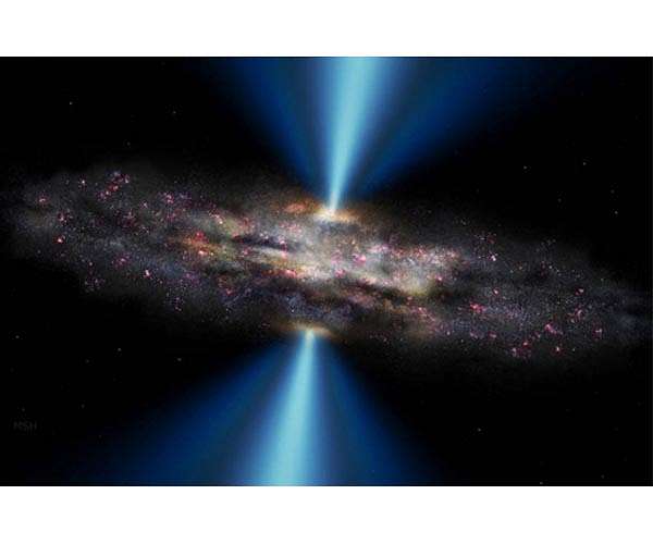 At the center of certain galaxies are objects of such tremendous brightness they outshine the rest of their galaxy by four orders of magnitude. Our understanding of these active galactic nuclei has progressed by leaps and bounds over the past several decades, though recently debate has centered on the identity of some of these objects. Now, a team of researchers has settled some questions and exposed exciting new findings about these cosmic phenomena. Their results appear in the Monthly Notices of the Royal Astronomical Society. Quasars, the most powerful active galactic nuclei, shine like lighthouses from their home galaxies. These beams are powered by supermassive black holes millions to billions of times the mass of the sun. "The [radius of this] black hole is 1/10,000th of the distance just to our nearest star, and yet it can produce the power of 10,000 entire galaxies," said coauthor Robert Antonucci, a physics professor at UC Santa Barbara. The gas around these black holes spins so fast that the color of the light it emits is stretched out. The material approaching us appears bluer, while receding gas appears redder. This stretches the normally sharp spikes in the light spectra into broad peaks. The radiation from these systems also energizes distant gas clouds, which are less dense. Because these clouds rotate more slowly, the peaks in their light emission stay sharp. And because they are less dense, the atoms have enough time to make slower transitions between energy states without interference from neighboring atoms, so scientists see additional spikes that are due to heat rather than radiation. A dim quasar is called a Seyfert galaxy, and the debate stems from the distinction between the two types of Seyfert galaxies. Type 1 galaxies produce both of these spectra, but the light from Type 2 galaxies is missing the broad peaks. Before they knew about the black holes at the center, scientists had thought the two were different entities, and were puzzled over what could be powering them. Antonucci had proposed that they were actually the same objects, simply seen from different perspectives. Namely, that when the broad regions were missing from the spectra, it was because we were looking at the systems side-on, and a ring of dust was obscuring the inner part of the nucleus from our view. Antonucci noticed that, unlike normal starlight, the light from Seyfert 2 galaxies tended to slightly favor one polarization, suggesting some of it had reflected our way, like sunlight off the surface of a lake. The polarization suggested that these photons had originated near the center of the black hole and traveled along the jets of high-energy matter that stream away from its poles. By filtering out everything except this polarization, Antonucci was able to peer into the center of the obscured object, and he found the missing broad spectra. This confirmed that there was matter swirling around the black hole emitting broad bands of light, only to have most of this blocked by the surrounding ring of dust. The two types of Seyfert galaxies were, in fact, one class of objects.