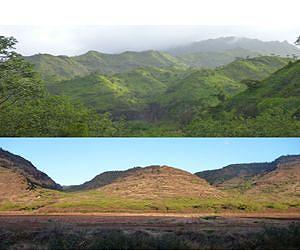 Rain versus the volcano Wind patterns sweep rain clouds from the ocean toward the peak of the island's volcano, where they rain out most of their moisture before passing over the rest of the island. As a result, annual rainfall is highest in the island's center, with a dramatic drop-off toward the coasts, and is also higher on the side of the island that faces the wind. If rainfall indeed has an effect on erosion, the team reasoned, then the island's erosion rates should exhibit a similarly dramatic pattern. To test their theory, the researchers first looked at Kauai's current topography, which features large canyons funneling into the middle of the island, with smaller valleys on the outskirts. They then created a map of what the island looked like when it first formed more than 4 million years ago, before erosion altered its surface. To do that, the researchers identified gently sloping, nearly planar surfaces around the island that likely are remnants of the volcano's original terrain. They then used a simple mathematical equation to, in essence, stretch the remnant surfaces together into a roughly conical shape - what Kauai's topography likely resembled when the island first formed. Ferrier and his colleagues then measured the difference between the modern topography and this reconstructed topography to estimate the amount of rock eroded over time - and divided this difference by the age of the uppermost volcanic flows to calculate an erosion rate. The researchers performed this exercise for more than 13,000 locations along 32 rivers throughout the island, measuring the erosion rates along each river. They then plotted these erosion rates against precipitation rates across the island and found that, after correcting for each river's steepness and the size of its drainage basin, rivers that received more rainfall eroded the land faster than those with less rain.