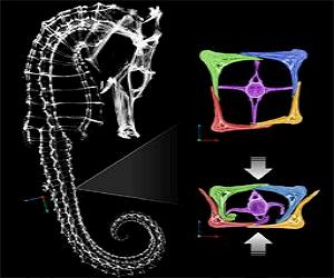 The tail of a seahorse can be compressed to about half its size before permanent damage occurs, engineers at the University of California, San Diego, have found. The tail's exceptional flexibility is due to its structure, made up of bony, armored plates, which slide past each other. Researchers are hoping to use a similar structure to create a flexible robotic arm equipped with muscles made out of polymer, which could be used in medical devices, underwater exploration and unmanned bomb detection and detonation. UC San Diego engineers, led by materials science professors Joanna McKittrick and Marc Meyers, detailed their findings in the March 2013 issue of the journal Acta Biomaterialia. "The study of natural materials can lead to the creation of new and unique materials and structures inspired by nature that are stronger, tougher, lighter and more flexible," said McKittrick, a professor of materials science at the Jacobs School of Engineering at UC San Diego. McKittrick and Meyers had sought bioinsipiration by examining the armor of many other animals, including armadillo, alligators and the scales of various fish. This time, they were specifically looking for an animal that was flexible enough to develop a design for a robotic arm. "The tail is the seahorse's lifeline," because it allows the animal to anchor itself to corals or seaweed and hide from predators, said Michael Porter, a Ph.D. student in materials science at the Jacobs School of Engineering. "But no one has looked at the seahorse's tail and bones as a source of armor." Most of the seahorse's predators, including sea turtles, crabs and birds, capture the animals by crushing them. Engineers wanted to see if the plates in the tail act as an armor. Researchers took segments from seahorses' tails and compressed them from different angles. They found that the tail could be compressed by nearly 50 percent of its original width before permanent damage occurred. That's because the connective tissue between the tail's bony plates and the tail muscles bore most of the load from the displacement. Even when the tail was compressed by as much as 60 percent, the seahorse's spinal column was protected from permanent damage. McKittrick and Meyers' research group uses a unique technique that applies a series of chemicals to materials to strip them of either their protein components or their mineral components. That allows them to better study materials' structures and properties. After treating the bony plates in the seahorse's tail with the chemicals, they discovered that the percentage of minerals in the plates was relatively low-40 percent, compared to 65 percent in cow bone. The plates also contained 27 percent organic compounds-mostly proteins-and 33 percent water. The hardness of the plates varied. The ridges were hardest, likely for impact protection-about 40 percent harder than the plate's grooves, which are porous and absorb energy from impacts. The seahorse's tail is typically made up of 36 square-like segments, each composed of four L-shaped corner plates that progressively decrease in size along the length of the tail. Plates are free to glide or pivot. Gliding joints allow the bony plates to glide past one another. Pivoting joints are similar to a ball-and-socket joint, with three degrees of rotational freedom. The plates are connected to the vertebrae by thick collagen layers of connective tissue. The joints between plates and vertebrae are extremely flexible with nearly six degrees of freedom. "Everything in biology comes down to structures," Porter said. The next step is to use 3D printing to create artificial bony plates, which would then be equipped with polymers that would act as muscles. The final goal is to build a robotic arm that would be a unique hybrid between hard and soft robotic devices. A flexible, yet robust robotic gripper could be used for medical devices, underwater exploration and unmanned bomb detection and detonation. The protected, flexible arm would be able to grasp a variety of objects of different shapes and sizes.