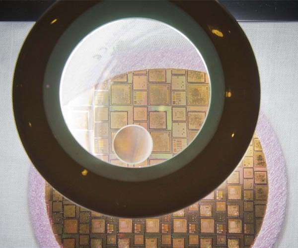 Tiny integrated circuits destined for space missions, etched onto a single wafer of silicon, examined under a magnifier. To save money on the high cost of fabrication, various chips designed by different companies and destined for multiple ESA projects are crammed onto the same silicon wafers, etched into place at specialised semiconductor manufacturing plants or 'fabs'. Once manufactured, the chips, still on the wafer, are tested. The wafers are then chopped up. They become ready for use when placed inside protective packages - just like standard terrestrial microprocessors - and undergo final quality tests. Through little metal pins or balls sticking out of their packages these miniature brains are then connected to other circuit elements - such as sensors, actuators, memory or power systems - used across the satellite. Considering the time and money needed to develop complex chips like these, ESA's Microelectronics section maintains a catalogue of chip designs, known as Intellectual Property (IP) cores, available to European industry through ESA licence. Think of these IP cores as the tiniest mission 'building blocks': specialised designs to perform particular tasks in space, laid down within a microchip. These range from single 'simpler' functions such as decoding signals from Earth to control the satellite to highly complex computer tasks such as operating a complete spacecraft.