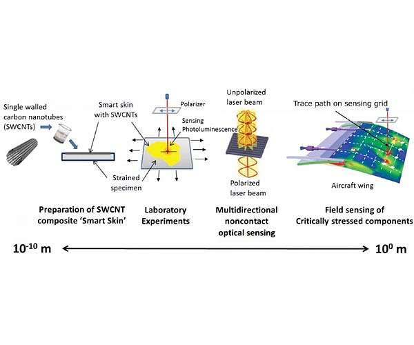 Thanks to one peculiar characteristic of carbon nanotubes, engineers will soon be able to measure the accumulated strain in an airplane, a bridge or a pipeline - or just about anything - over the entire surface or down to microscopic levels. They'll do so by shining a light onto structures coated with a two-layer nanotube film and protective polymer. Strain in the surface will show up as changes in the wavelengths of near-infrared light emitted from the film and captured by a miniaturized hand-held reader. The results will show engineers and maintenance crews whether structures like bridges or aircraft have been deformed by stress-inducing events or regular wear and tear. Like a white shirt under an ultraviolet light, single-wall carbon nanotubes fluoresce, a property discovered in 2002 in the lab of Rice chemist Bruce Weisman. In a basic research project a few years later, the group showed that stretching a nanotube changes the color of its fluorescence. When Weisman's results came to the attention of Rice civil and environmental engineer Satish Nagarajaiah - who had been working independently on similar ideas using Raman spectroscopy, but at the macro scale, since 2003 - he suggested collaborating to turn that scientific phenomenon into a useful technology for strain sensing. Now, Nagarajaiah and Weisman and have published a pair of important papers about their "smart skin" project. The first appears in Structural Control and Health Monitoring, and introduces the latest iteration of the technology they first revealed in 2012. It describes a method of depositing the microscopic nanotube-sensing film separately from a protective top layer. Color changes in the nanotube emission indicate the amount of strain in the underlying structure. The researchers say it enables two-dimensional mapping of accumulated strain that can't be achieved by any other non-contact method. The second paper, in the Journal of Structural Engineering, details the results of testing smart skin on metal specimens with irregularities where stress and strain are often concentrated. "The project started out as pure science about nanotube spectroscopy, and led to the proof-of-principle collaborative work that showed we could measure the strain of the underlying substrate by checking the spectrum of the film in one place," Weisman said. "That suggested the method could be expanded to measure whole surfaces. What we've shown now is a lot closer to that practical application." Since the initial report, the researchers have refined the composition and preparation of the film and its airbrush-style application, and also developed scanner devices that automatically capture data from multiple programmed points. Unlike conventional sensors that only measure strain at one point along one axis, the smart film can be selectively probed to reveal strain in any direction and location. The two-layer film is only a few microns thick, a fraction of the width of a human hair, and barely visible on a transparent surface. "In our initial films, the nanotube sensors were mixed into the polymer," Nagarajaiah said. "Now that we've separated the sensing and the protective layers, the nanotube emission is clearer and we can scan at a much higher resolution. That lets us capture significant amounts of data rather quickly." The researchers tested smart skin on aluminum bars under tension with either a hole or a notch to represent the places where strain tends to build. Measuring these potential weak spots in their unstressed state and then again after applying stress showed dramatic changes in strain patterns pieced together from point-by-point surface mapping. "We know where the high-stress regions of the structure are, the potential points of failure," Nagarajaiah said. "We can coat those regions with the film and scan them in the healthy state, and then after an event like an earthquake, go back and re-scan to see whether the strain distribution has changed and the structure is at risk." In their tests, the researchers said the measured results were a close match to strain patterns obtained through advanced computational simulations. Readings from the smart skin allowed them to quickly spot distinctive patterns near the high-stress regions, Nagarajaiah said. They were also able to see clear boundaries between regions of tensile and compressive strain. "We measured points 1 millimeter apart, but we can go 20 times smaller when necessary without sacrificing strain sensitivity," Weisman said. That's a leap over standard strain sensors, which only provide readings averaged over several millimeters, he said. The researchers see their technology making initial inroads in niche applications, like testing turbines in jet engines or structural elements in their development stages. "It's not going to replace all existing technologies for strain measurement right away," Weisman said. "Technologies tend to be very entrenched and have a lot of inertia. "But it has advantages that will prove useful when other methods can't do the job," he said. "I expect it will find use in engineering research applications, and in the design and testing of structures before they are deployed in the field." With their smart skin refined, the researchers are working toward developing the next generation of the strain reader, a camera-like device that can capture strain patterns over a large surface all at once.