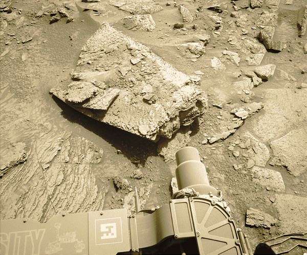 The image above shows one of today's cool rocks. APXS and MAHLI are both investigating the bumpy, ridged surface on the side nearest the rover, a target named 'Mamore,' backed up with Mastcam images. ChemCam is also looking at this surface, particularly one of the ridges called 'Jacunda.' Slightly further afield, Mastcam is also looking at two of the craters in the cluster and a distant rock 'Triunfo.' ChemCam is also taking a long-distance mosaic of the Gediz Vallis ridge.