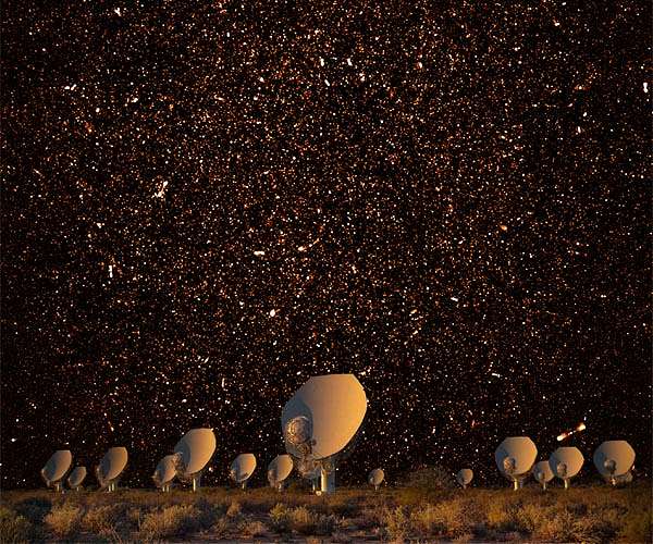 Look at this new radio image covered with dots, each of which is a distant galaxy! The brightest spots are galaxies that are powered by supermassive black holes and shine bright in radio light. But what makes this image special are the numerous faint dots filling the sky. These are distant galaxies like our own that have never been observed in radio light before. To learn about the star-formation history of the universe, we need to look back in time. Galaxies throughout the universe have been forming stars for the past 13 billion years. But most stars were born between 8 and 11 billion years ago, during an era called "cosmic noon." It has been a challenge for astronomers to study the faint light coming from this era. Optical telescopes, like SALT in Sutherland, can see very distant galaxies, but new stars are largely hidden inside dusty clouds of gas. Radio telescopes can see through the dust and observe the rare, bright "starburst" galaxies, but until now have not been sensitive enough to detect the signals from distant Milky Way-like galaxies that are responsible for most of the star formation in the universe. An international team of astronomers, using the South African Radio Astronomy Observatory (SARAO) MeerKAT telescope near Carnarvon in the Northern Cape, recently made the first radio observation sensitive enough to reveal these galaxies. "To make this image, we selected an area in the Southern Sky that contains no strong radio sources whose glare could blind a sensitive observation," said Tom Mauch of SARAO in Cape Town, who led the team that published their results in The Astrophysical Journal. The team used the 64 MeerKAT dishes to observe this area for a total of 130 hours. The resulting image shows a region of the sky that is comparable in area to five full Moons, containing tens of thousands of galaxies. "Because radio waves travel at the speed of light, this image is a time machine that samples star formation in these distant galaxies over billions of years," explained co-author James Condon of the National Radio Astronomy Observatory in the USA. "Because only short-lived stars that are less than 30 million years old send out radio waves, we know that the image is not contaminated by old stars. The radio light we see from each galaxy is therefore proportional to its star-forming rate at that moment in time." The astronomers want to use this image to learn more about star formation in the entire universe. "These first results indicate that the star-formation rate around cosmic noon is even higher than was originally expected," said Allison Matthews, a PhD student at the University of Virginia. "Previous images could only detect the tip of the iceberg, the rare and luminous galaxies that produced only a small fraction of the stars in the universe. What we see now is the complete picture: these faint dots are the galaxies that formed most of the stars in the universe." "MeerKAT is the best radio array in the world for studies like this one because it is the first to use such a large number of extremely low-noise clear-aperture dishes," explained SARAO Chief Technologist Justin Jonas. As a result, the MeerKAT image (nicknamed "DEEP2") is more sensitive to distant star-forming galaxies than any previous view of the radio sky.