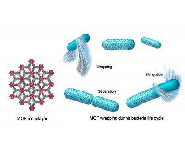 A hybrid of bacteria and semiconductor The hybrid system takes advantage of efficient light capture by semiconductors to feed electrons to anaerobic bacteria, which normally scavenge electrons from their environment to live. The goal is to boost carbon capture by the bacteria to churn out useful carbon compounds. "We are interfacing these bugs with a semiconductor that overwhelms them with electrons, so they can do more chemistry," Yang said. "But at the same time this process also generates all these reactive oxygen species, which are detrimental to the bugs. We are putting these bacteria in a shell so that if any of these oxidative species comes in, this first defense, the shell, decomposes them." The suit is made of a MOF mesh that wraps around the bacteria, covering it in patches. Wearing these MOF suits, the bacteria live five times longer at normal oxygen concentrations - 21 percent by volume - than without the suits, and often longer than in their natural environment, Yang said. Their normal lifespan ranges from weeks to months, after which they can be flushed from the system and replaced with a fresh batch. In this experiment, the researchers used bacteria called Morella thermoacetica, which produce acetate (acetic acid, or vinegar), a common precursor in the chemical industry. Another one of their test bacteria, Sporomusa ovata, also produces acetate. "We picked these anaerobic bacteria because their selectivity toward one chemical product is always 100 percent," he said. "In our case, we picked a bug that gives us acetate. But you could select another bug to give you methane or alcohol." In fact, the bacteria that ferment the alcohol in beer and wine and turn milk into cheese and yoghurt are all anaerobic. While Yang's first experiments with the hybrid system paired bacteria with a bristle of silicon nanowires, in 2016 he discovered that feeding the bacteria cadmium encouraged them to decorate themselves with a natural semiconductor, cadmium sulfide, that acts as an efficient light absorber feeding the bacteria electrons. In the current experiment, the researchers took bacteria decorated with cadmium sulfide and enshrouded them with a flexible, one nanometer thick layer of MOF. While a rigid MOF interfered with the bacteria's normal process of growth and splitting, a zirconium-based MOF patch turned out to be soft enough to allow the bacteria to swell and divide while still clothed with MOF, after which new MOF in the solution re-clothed them. "You can think of the 2D MOF like a sheet of graphene: a one-layer-thick cloak that covers the bacteria," said co-author Omar Yaghi, a pioneer of MOFs and the James and Neeltje Tretter Chair in the Department of Chemistry. "The 2D MOF is floating in solution with the bacteria, and as the bacteria replicate they are covered further with the 2D MOF layer, so it protects the bacteria from oxygen." Yang and his colleagues are also working to improve the hybrid system's efficiency of light capture, electron transfer and production of specific compounds. They envision combining these optimized capabilities with new metabolic pathways in these bacteria to produce ever more complex molecules. "Once you fix or activate CO2 - and that is the most difficult part - you can use many existing chemical and biological approaches to upgrade them to fuels, pharmaceuticals and commodity chemicals," he said.