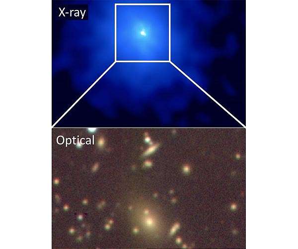Fluffs or points "We started asking ourselves why we had not found it earlier, because it's very extreme in its properties and very bright," McDonald says. "It's because we had preconceived notions of what a cluster should look like. And this didn't conform to that, so we missed it." For the most part, he says astronomers have assumed that galaxy clusters look "fluffy," giving off a very diffuse signal in the X-ray band, unlike brighter, point-like sources, which have been interpreted as extremely active quasars or black holes. "The images are either all points, or fluffs, and the fluffs are these giant million-light-year balls of hot gas that we call clusters, and the points are black holes that are accreting gas and glowing as this gas spirals in," McDonald says. "This idea that you could have a rapidly accreting black hole at the center of a cluster - we didn't think that was something that happened in nature." But the Phoenix discovery proved that galaxy clusters could indeed host immensely active black holes, prompting McDonald to wonder: Could there be other nearby galaxy clusters that were simply misidentified?