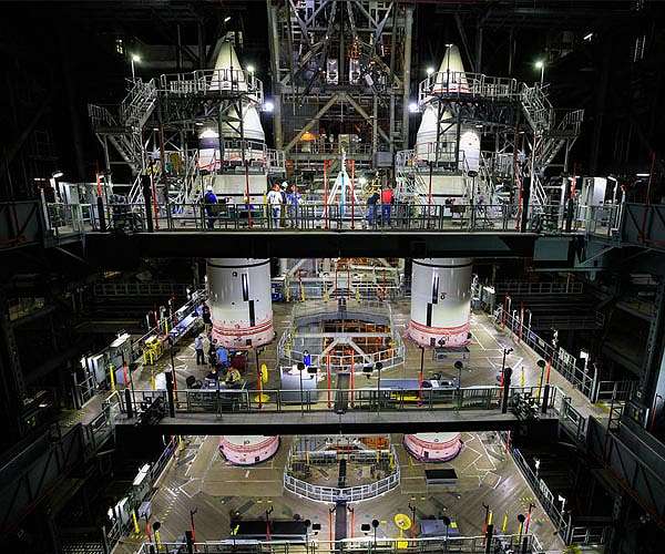 Stacking is complete for the twin Space Launch System (SLS) solid rocket boosters for NASA's Artemis I mission. Over several weeks, workers used one of five massive cranes to place 10 booster segments and nose assemblies on the mobile launcher inside the Vehicle Assembly Building (VAB) at NASA's Kennedy Space Center in Florida. Engineers with Exploration Ground Systems placed the first segment on Nov. 21, 2020, and continued the process until the final nose assembly was placed on March 2. Prior to the arrival of the core stage, the team will finish installing electrical instrumentation and pyrotechnics, then test the systems on the boosters. When the SLS core stage arrives at Kennedy, technicians will transport it to the VAB, and then stack it on the mobile launcher between the two boosters. The SLS will be the most powerful rocket in the world, producing up to 8.8 million pounds of thrust during its Artemis I launch. Artemis I will be an uncrewed test of the Orion spacecraft and SLS rocket as an integrated system ahead of crewed flights to the Moon. Under the Artemis program, NASA aims to land the first woman and the next man on the Moon and establish sustainable lunar exploration.