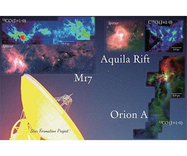 Astronomers have captured new, detailed maps of three nearby interstellar gas clouds containing regions of ongoing high-mass star formation. The results of this survey, called the Star Formation Project, will help improve our understanding of the star formation process. We know that stars such as the Sun are born from interstellar gas clouds. These interstellar gas clouds are difficult to observe in visible light, but emit strong radio wavelength, which can be observed by the Nobeyama 45-m Radio Telescope in Japan. A research team led by Fumitaka Nakamura, an Assistant Professor at the National Astronomical Observatory of Japan (NAOJ), used the telescope to create detailed radio maps of interstellar gas clouds, the birthplaces of stars. The team including members from NAOJ, the University of Tokyo, Tokyo Gakugei University, Ibaraki University, Otsuma Women's University, Niigata University, Nagoya City University, and other universities, will use the observational data to investigate the star formation process. The team targeted three interstellar clouds: the Orion A, Aquila Rift, and M17 regions. For the Orion A region, the group collaborated with the CARMA interferometer in the United States, combining their data to create the most detailed map ever of the region. The resultant map has a spatial resolution of about 3200 astronomical units. This means that the map can reveal details as small as 60 times the size of the Solar System. Even the world's most powerful radio telescope, the Atacama Large Millimeter/submillimeter Array (ALMA), could not obtain a similar large-scale map of Orion A because of ALMA's limited field-of-view and observation time constraints. But ALMA can investigate more distant interstellar clouds. Therefore, this large-scale, most-detailed radio map of the Orion A gas cloud obtained by the Star Formation Project is complementary with other observational research.