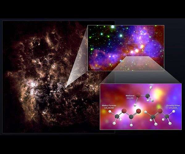 Unlike the Milky Way, this semi-spiral collection of a few tens-of-billions of stars lacks our galaxy's rich abundance of heavy elements, like carbon, oxygen, and nitrogen. With such a dearth of heavy elements, astronomers predict that the LMC should contain a comparatively paltry amount of complex carbon-based molecules. Previous observations of the LMC seem to support that view. New observations with the Atacama Large Millimeter/submillimeter Array (ALMA), however, have uncovered the surprisingly clear chemical "fingerprints" of the complex organic molecules methanol, dimethyl ether, and methyl formate. Though previous observations found hints of methanol in the LMC, the latter two are unprecedented findings and stand as the most complex molecules ever conclusively detected outside of our galaxy. Astronomers discovered the molecules' faint millimeter-wavelength "glow" emanating from two dense star-forming embryos in the LMC, regions known as "hot cores." These observations may provide insights into the formation of similarly complex organic molecules early in the history of the universe. "Even though the Large Magellanic Cloud is one of our nearest galactic companions, we expect it should share some uncanny chemical similarity with distant, young galaxies from the early universe," said Marta Sewilo, an astronomer with NASA's Goddard Space Flight Center in Greenbelt, Maryland, and lead author on a paper appearing in the Astrophysical Journal Letters. Astronomers refer to this lack of heavy elements as "low metallicity." It takes several generations of star birth and star death to liberally seed a galaxy with heavy elements, which then get taken up in the next generation of stars and become the building blocks of new planets. "Young, primordial galaxies simply didn't have enough time to become so chemically enriched," said Sewilo. "Dwarf galaxies like the LMC probably retained this same youthful makeup because of their relatively low masses, which severely throttles back the pace of star formation." "Due to its low metallicity, the LMC offers a window into these early, adolescent galaxies," noted Remy Indebetouw, an astronomer at the National Radio Astronomy Observatory in Charlottesville, Virginia, and coauthor on the study. "Star-formation studies of this galaxy provide a stepping stone to understand star formation in the early universe." The astronomers focused their study on the N113 Star Formation Region in the LMC, which is one of the galaxy's most massive and gas-rich regions. Earlier observations of this area with NASA's Spitzer Space Telescope and ESA's Herschel Space Observatory revealed a startling concentration of young stellar objects - protostars that have just begun to heat their stellar nurseries, causing them to glow brightly in infrared light. At least a portion of this star formation is due to a domino-like effect, where the formation of massive stars triggers the formation of other stars in the same general vicinity. Sewilo and her colleagues used ALMA to study several young stellar objects in this region to better understand their chemistry and dynamics. The ALMA data surprisingly revealed the telltale spectral signatures of dimethyl ether and methyl formate, molecules that have never been detected so far from Earth. Complex organic molecules, those with six or more atoms including carbon, are some of the basic building blocks of molecules that are essential to life on Earth and - presumably - elsewhere in the universe. Though methanol is a relatively simple compound compared to other organic molecules, it nonetheless is essential to the formation of more complex organic molecules, like those that ALMA recently observed, among others. If these complex molecules can readily form around protostars, it's likely that they would endure and become part of the protoplanetary disks of young star systems. Such molecules were likely delivered to the primitive Earth by comets and meteorites, helping to jumpstart the development of life on our planet. The astronomers speculate that since complex organic molecules can form in chemically primitive environments like the LMC, it's possible that the chemical framework for life could have emerged relatively early in the history of the universe. "The Detection of Hot Cores and Complex Organic Molecules in the Large Magellanic Cloud," M. Sewilo et al., 2018 Feb. 1, Astrophysical Journal Letters