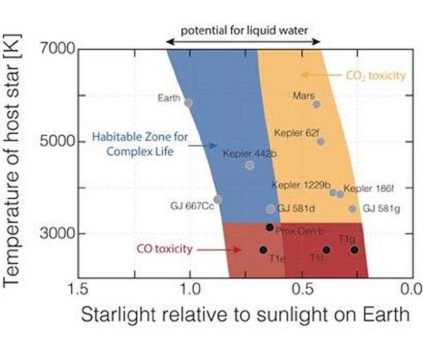 Scientists may need to rethink their estimates for how many planets outside our solar system could host a rich diversity of life. In a new study, a UC Riverside-led team discovered that a buildup of toxic gases in the atmospheres of most planets makes them unfit for complex life as we know it. Traditionally, much of the search for extraterrestrial life has focused on what scientists call the "habitable zone," defined as the range of distances from a star warm enough that liquid water could exist on a planet's surface. That description works for basic, single-celled microbes - but not for complex creatures like animals, which include everything from simple sponges to humans. The team's work, published in The Astrophysical Journal, shows that accounting for predicted levels of certain toxic gases narrows the safe zone for complex life by at least half - and in some instances eliminates it altogether. "This is the first time the physiological limits of life on Earth have been considered to predict the distribution of complex life elsewhere in the universe," said Timothy Lyons, one of the study's co-authors, a distinguished professor of biogeochemistry in UCR's Department of Earth and Planetary Sciences, and director of the Alternative Earths Astrobiology Center, which sponsored the project. "Imagine a 'habitable zone for complex life' defined as a safe zone where it would be plausible to support rich ecosystems like we find on Earth today," Lyons explained. "Our results indicate that complex ecosystems like ours cannot exist in most regions of the habitable zone as traditionally defined." Using computer models to study atmospheric climate and photochemistry on a variety of planets, the team first considered carbon dioxide. Any scuba diver knows that too much of this gas in the body can be deadly. But planets too far from their host star require carbon dioxide - a potent greenhouse gas - to maintain temperatures above freezing. Earth included. "To sustain liquid water at the outer edge of the conventional habitable zone, a planet would need tens of thousands of times more carbon dioxide than Earth has today," said Edward Schwieterman, the study's lead author and a NASA Postdoctoral Program fellow working with Lyons. "That's far beyond the levels known to be toxic to human and animal life on Earth." The new study concludes that carbon dioxide toxicity alone restricts simple animal life to no more than half of the traditional habitable zone. For humans and other higher order animals, which are more sensitive, the safe zone shrinks to less than one third of that area. What is more, no safe zone at all exists for certain stars, including two of the Sun's nearest neighbors, Proxima Centauri and TRAPPIST-1. The type and intensity of ultraviolet radiation that these cooler, dimmer stars emit can lead to high concentrations of carbon monoxide, another deadly gas. Carbon monoxide binds to hemoglobin in animal blood - the compound that transports oxygen through the body. Even small amounts of it can cause the death of body cells due to lack of oxygen. Carbon monoxide cannot accumulate on Earth because our hotter, brighter Sun drives chemical reactions in the atmosphere that destroy it quickly. Although the team concluded recently that microbial biospheres may be able to thrive on a planet with abundant carbon monoxide, Schwieterman emphasized that "these would certainly not be good places for human or animal life as we know it on Earth." Scientists have confirmed nearly 4,000 planets orbiting stars other than the Sun, but none of them will be possible to visit in person. They are simply too far away. Closest is Proxima Centauri b, which would take 54,400 years for current spacecraft to reach. Using telescopes to detect abundances of certain gases in their atmospheres is one of the only ways to study these so-called exoplanets. "Our discoveries provide one way to decide which of these myriad planets we should observe in more detail," said Christopher Reinhard, a former UCR graduate student now an assistant professor at the Georgia Institute of Technology, co- author of this study, and co-leader of the Alternative Earths team. "We could identify otherwise habitable planets with carbon dioxide or carbon monoxide levels that are likely too high to support complex life." Findings from the team's previous work is already informing next-generation space missions such as NASA's proposed Habitable Exoplanet Observatory. For example, because oxygen is essential to complex life on Earth and can be detected remotely, the team has been studying how common it may be in different planets' atmospheres. Other than Earth, no planet in our solar system hosts life that can be characterized from a distance. If life exists elsewhere in the solar system, Schwieterman explained, it is deep below a rocky or icy surface. So, exoplanets may be our best hope for finding habitable worlds more like our own. "I think showing how rare and special our planet is only enhances the case for protecting it," Schwieterman said. "As far as we know, Earth is the only planet in the universe that can sustain human life."