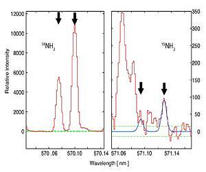 A team of astronomers, led by Ph.D. candidate Yoshiharu Shinnaka and Professor Hideyo Kawakita, both from Kyoto Sangyo University, successfully observed the Comet ISON during its bright outburst in the middle of November 2013. Subaru Telescope's High Dispersion Spectrograph (HDS) detected two forms of nitrogen--14NH2 and 15NH2--in the comet. This is the first time that astronomers have reported a clear detection of the relatively rare isotope 15NH2 in a single comet and also measured the relative abundance of two different forms of nitrogen ("nitrogen isotopic ratio") of cometary ammonia (NH3) (Figure 1). Their results support the hypothesis that there were two distinct reservoirs of nitrogen the massive, dense cloud ("solar nebula") from which our Solar System may have formed and evolved. Why did the team focus on studying these different forms of nitrogen in the comet? Comets are relatively small Solar System objects composed of ice and dust, which formed 4.6 billion years ago in the solar nebula when our Solar System was in its infancy. Because they usually reside in cold regions far from the Sun, e.g., the Kuiper belt and Oort cloud, they probably preserve information about the physical and chemical conditions in the early Solar System. Different forms and abundances of the same molecule provide information about their source and evolution. Were they from a stellar nursery (a primordial interstellar cloud) or from a distinctive cloud (solar nebula) that may have formed our Solar System's star, the Sun? Scientists do not yet understand very well how cometary molecules separate into isotopes with different abundances. Isotopes of nitrogen from ammonia (NH3) may hold the key. Ammonia (NH3) is a particularly important molecule, because it is the most abundant nitrogen-bearing volatile (a substance that vaporizes) in cometary ice and one of the simplest molecules in an amino group (-NH2) closely related to life. This means that these different forms of nitrogen could link the components of interstellar space to life on Earth as we know it. Since ammonia is the major carrier of nitrogen in a comet, it is necessary to clear it from the relative abundance of its isotopes to understand how 15NH2 separates in cometary molecules. However, the direct detection of cometary ammonia is difficult, and there are only a few reports of its clear detection. Therefore, the team concentrated on studying the form of NH2 developed after the ammonia was broken down by the light ("photodissociation") in the cometary coma. The team was fortunate to observe the comet as it neared the Sun, when its icy composition was evaporating. They were also fortunate that NH2, a derivative of ammonia (NH3), is easy to observe in the optical wavelength, and the relative abundance of nitrogen isotopes of cometary ammonia is probably close to that of NH2. The team used Subaru Telescope's HDS to successfully observe Comet ISON on November 15th and 16th (UT) ("Spectrum of Outburst from Comet ISON Obtained by Subaru Telescope's High-Dispersion Spectrograph", December 2, 2013 Subaru Telescope press release), when the comet had its bright outburst that began on November 14th. The observation clearly detected 15NH2 from Comet ISON, and the team inferred that the ratio of cometary ammonia of 14N/15N (139+/-38) is consistent with the average (14N/15N~130) of that from the spectra of 12 other comets. In other words, Comet ISON is typical in its relative abundance of 14N/15N in cometary ammonia. These findings support the hypothesis that there were two distinct reservoirs of nitrogen in the solar nebula: 1) primordial N2 gas having a protosolar value of 14N/15N, and 2) less volatile and probably solid molecules having a ratio of about 14N/15N~150 in the solar nebula. In the case of a dense molecular cloud core, the isotopic ratio of hydrogen cyanide (HCN) is similar to that of comets while its ratio in ammonia is different from its cometary value (Figure 2). This may mean that the ammonia formed in an environment of a low temperature dust surface, not in the gas of the molecular cloud. Laboratory experiments show that various complex molecules can form on the surface of low temperature dust. If the ammonia molecule formed on the low temperature dust surface, the cometary nucleus could contain a complex molecule that relates to the origin of life, in addition to the ammonia. If this is so, it raises the possibility that the comet brought these materials to Earth. In the future, the team would like to increase the sample of comets for which nitrogen isotopic ratios of cometary ammonia have been determined. They would also like to carry out laboratory measurements of 15NH2 to obtain more precise isotopic ratios. On a larger scale, the team hopes to investigate the origin of Comet ISON and the mechanisms that triggered its outburst so that we can better understand the evolution of the Solar System. These results will be published on February 20, 2014 as: Shinnaka, Y., Kawakita, H., Kobayashi, H., Nagashima, M., and Boice, D.C. 2014 "14NH2/15NH2 ratio in Comet C/2010 S1 (ISON) observed during its Outburst in November 2013)" Astrophysical Journal Letters, V 782, L106