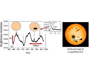 A team of astronomers has used the High Dispersion Spectrograph on the Subaru Telescope to conduct spectroscopic observations of Sun-like "superflare" stars first observed and cataloged by the Kepler Space Telescope. The investigations focused on the detailed properties of these stars and confirmed that Sun-like stars with large starspots can experience superflares. The team, made up of astronomers from Kyoto University, University of Hyogo, the National Astronomical Observatory of Japan (NAOJ), and Nagoya University, targeted a set of solar-type stars emitting very large flares that release total energies 10-10000 times greater than the biggest solar flares. Solar flares are energetic explosions in the solar atmosphere and are thought to occur by intense releases of magnetic energy around the sunspots. Large flares often cause massive bursts of high-speed plasma called coronal mass ejections (CMEs), can lead to geomagnetic storms on Earth. Such storms can have severe impacts on our daily life by affecting such systems as communications and power grids. This work follows up on observations made in 2012 (Maehara et al. Nature on 2012 May 24), where the team reported finding several hundred superflares on solar-type stars by analyzing stellar observation data from Kepler Space Telescope. This discovery was very important since it enabled the astronomers to conduct statistical analysis of superflares for the first time. However, more detailed observations were needed to investigate detailed properties of superflare stars and whether such massive flares can occur on ordinary single stars similar to our Sun. Based on the initial discovery, the team carried out spectroscopic observations on 50 solar-type superflare stars selected from the Kepler Space Telescope's data. From the investigation of the detailed properties of spectral lines, the team obtained the following results: 1.More than half the observed 50 stars show no evidence of binarity (that is, they are not binary stars). The team confirmed the characteristics of the target stars as similar to those of the Sun. 2.On the basis of the Kepler data, superflare stars show somewhat regular, periodic changes in their brightnesses. The typical periods range from one day to a few tens of days. Such variations are explained by the rotation of the star and its starspots. As shown in Figure 1, the stars seem to become dimmer when their starspots are on their visible sides. Moreover, the timescales of the brightness variations should correspond to the stars' rotation speeds. Spectroscopic observations allow observers to estimate the rotation velocity from the broadening of absorption lines (Figure 2), and confirm that a velocity derived from spectroscopic data matches the brightness variation timescale as the star rotates. In addition, the measured rotation velocity of some target superflare stars is as slow as that of the Sun. 3.Based on solar observations, astronomers know that if there are large dark star spots on a stellar surface, the "core depth" (the depth and width of a spectral line) of the Ca II 854.2[nm] (ionized Calcium) absorption line becomes shallow. Using this, they investigated the core depth of Ca II 854.2 [nm] line, and found that superflare stars have large starspots compared to sunspots (Figure 3). The results of these observations and analysis confirm that stars similar to the Sun can have superflares if they have large starspots. In the future, in addition to the continuing spectroscopic observations with Subaru Telescope, the team will conduct observations with the Kyoto University's Okayama 3.8m telescope, which is now under construction. This will allow them to investigate more detailed properties and changes in long-term activity of superflare stars.
