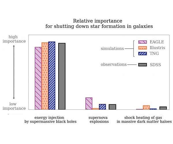 Black holes with masses equivalent to millions of suns do put a brake on the birth of new stars, say astronomers. Using machine learning and three state of the art simulations to back up results from a large sky survey, the researchers resolve a 20-year long debate on the formation of stars. Joanna Piotrowska, a PhD student at the University of Cambridge, will present the new work today (Tuesday 20 July) at the virtual National Astronomy Meeting (NAM 2021). Star formation in galaxies has long been a focal point of astronomy research. Decades of successful observations and theoretical modelling resulted in our good understanding of how gas collapses to form new stars both in and beyond our own Milky Way. However, thanks to all-sky observing programmes like the Sloan Digital Sky Survey (SDSS), astronomers realised that not all galaxies in the local Universe are actively star-forming - there exists an abundant population of "quiescent" objects which form stars at significantly lower rates. The question of what stops star formation in galaxies remains the biggest unknown in our understanding of galaxy evolution, debated over the past 20 years. Piotrowska and her team set up an experiment to find out what might be responsible. Using three state-of-the-art cosmological simulations - EAGLE, Illustris and IllustrisTNG - the astronomers investigated what we would expect to see in the real Universe as observed by the SDSS, when different physical processes were halting star formation in massive galaxies. The astronomers applied a machine learning algorithm to classify galaxies into star-forming and quiescent, asking which of three parameters: the mass of the supermassive black holes found at the centre of galaxies (these monster objects have typically millions or even billions of times the mass of our Sun), the total mass of stars in the galaxy, or the mass of the dark matter halo around galaxies, best predicts how galaxies turn out. These parameters then enabled the team to work out which physical process: energy injection by supermassive black holes, supernova explosions or shock heating of gas in massive halos is responsible for forcing galaxies into semi-retirement. The new simulations predict the supermassive black hole mass as the most important factor in putting the brakes on star formation. Crucially, the simulation results match observations of the local Universe, adding weight to the researchers' findings. Piotrowska says: "It's really exciting to see how the simulations predict exactly what we see in the real Universe. Supermassive black holes - objects with masses equivalent to millions or even billions of Suns - really do have a big effect on their surroundings. These monster objects force their host galaxies into a kind of semi-retirement from star formation."