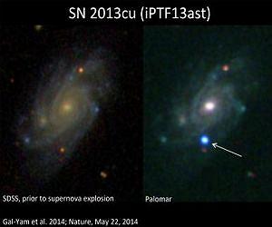 Supernovae-stellar explosions-are incredibly energetic, dynamic events. It is easy to imagine that they are uncommon, but the universe is a big place and supernovae are actually fairly routine. The problem with observing supernovae is knowing just when and where one is occurring and being able to point a world-class telescope at it in the hours immediately afterward, when precious data about the supernova's progenitor star is available. Fortunately the intermediate Palomar Transient Factory (iPTF) operated by Caltech scans the sky constantly in search of dramatic astrophysical events. In 2013, it caught a star in the act of exploding. The iPTF is a robotic observing system mounted on the 48-inch Samuel Oschin Telescope on Palomar Mountain. It has been scanning the sky since February 2013. The iPTF (and its predecessor experiment, the Palomar Transient Factory [PTF], which operated between 2009 and 2012) regularly observes a wide swath of the night sky looking for astronomical objects that are moving and developing quickly, such as comets, asteroids, gamma-ray bursts, and supernovae. Both the earlier PTF and the current iPTF collaborations are led by Shrinivas Kulkarni, the John D. and Catherine T. MacArthur Professor of Astronomy and Planetary Science and director of the Caltech Optical Observatories. Last year the iPTF discovered an object of special interest: a supernova with a spectral signature suggesting that its progenitor star was a Wolf-Rayet star. Massive stars are typically structured like an onion, with the heaviest elements in the core, while lighter elements are layered over them and then frosted, if you will, by a layer of hydrogen gas on the stellar surface. Wolf-Rayet stars, which are unusually large and hot, are exceptions to this rule, being relatively deficient in hydrogen and characterized by strong stellar winds. Astronomers have long wondered if Wolf-Rayet stars are the progenitors of certain types of supernovae, and according to a recent paper published in Nature this is just what the iPTF found in May 2013. This supernova, SN2013cu, was picked up on a routine sky scan by the iPTF. The on-duty iPTF team member in Israel promptly sounded an alert, asking colleagues at the W. M. Keck Observatory on Mauna Kea to take a spectral image of the supernova before the sun rose in Hawaii. When supernovae explode, they briefly ionize the sky immediately around them. The ionized materials rapidly recombine, producing unique spectral features that enable astronomers to get a full picture of the ambient material of a supernova event. This process lasts from minutes to a few days and hence is called a "flash spectrum" of the event. Flash spectrography is a novel observational method developed by Avishay Gal-Yam of the Weizmann Institute of Science in Israel, leader of the team that published the Nature paper. In the case of SN2013cu, the flash spectrum showed relatively less hydrogen and relatively more nitrogen, suggesting that perhaps the progenitor of the supernova was a nitrogen-rich Wolf-Rayet star. This finding will enable astronomers to better understand the evolution of massive stars and identify potential progenitors of supernovae. "I could not believe my eyes when I saw those high-ionization features perfectly matching emission lines from a Wolf-Rayet star," says Yi Cao, a graduate student from Caltech who works with Kulkarni. "Our software pipeline efforts were paying off. Now we are working even harder so that we can get flash spectra of many more supernova flavors to probe their progenitor stars." Above all, the observation of SN2013cu highlights the success of the intermediate Palomar Transient Factory at catching the universe in the act of doing something interesting, something that might merit a second look. Though especially intriguing, SN2013cu is only one of over 2,000 supernovae that PTF/iPTF has detected during its four and a half years of observations. As Kulkarni remarks, "I am proud of how the global iPTF network is working together to invent new techniques enabling entirely new science." Coauthors on the paper, "A Wolf-Rayet-like progenitor of supernova SN 2013cu from spectral observations of a wind," include Kulkarni, Cao, Mansi Kasliwal, Daniel Perley, and Assaf Horesh of Caltech; Gal-Yam, I. Arcavi, E. O. Ofek, S. Ben-Ami, A. De Cia, D. Tal, P. M. Vreeswijk, and O. Yaron of the Weizmann Institute of Science; S. B. Cenko of NASA's Goddard Space Flight Center; J. C. Wheeler and J. M. Silverman of the University of Texas at Austin; F. Taddia and J. Sollerman of Stockholm University; P. E. Nugent of the Lawrence Berkeley National Laboratory; and A. V. Filippenko of UC Berkeley.