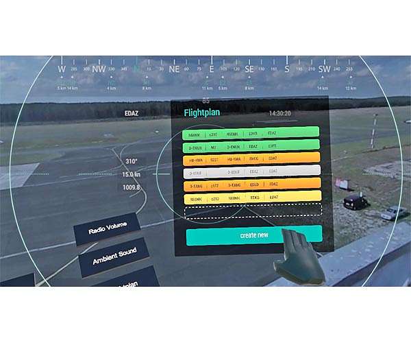 Looking through virtual 'binoculars' Their head movements allow them to intuitively alter the direction of the PTZ camera, so that they can monitor the airfield site and the traffic in a similar way to using binoculars. To give the air traffic controller a better overall view, the PTZ camera image is supplemented with a simple panoramic image of the airfield. The VR headset also enables the operator to interact with the workplace systems and other participants. The operator could, for instance, use virtual control elements to communicate with other air traffic control services, operate airfield systems or process electronic flight strips.