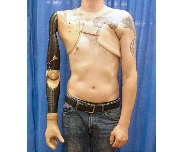 Humans can accurately sense the position, speed and torque of their limbs, even with their eyes shut. This sense, known as proprioception, allows humans to precisely control their body movements. Despite significant improvements to prosthetic devices in recent years, researchers have been unable to provide this essential sensation to people with artificial limbs, limiting their ability to accurately control their movements. Researchers at the Center for Extreme Bionics at the MIT Media Lab have invented a new neural interface and communication paradigm that is able to send movement commands from the central nervous system to a robotic prosthesis, and relay proprioceptive feedback describing movement of the joint back to the central nervous system in return. This new paradigm, known as the agonist-antagonist myoneural interface (AMI), involves a novel surgical approach to limb amputation in which dynamic muscle relationships are preserved within the amputated limb. The AMI was validated in extensive pre-clinical experimentation at MIT, prior to its first surgical implementation in a human patient at Brigham and Women's Faulkner Hospital. In a paper published in Science Translational Medicine, the researchers describe the first human implementation of the agonist-antagonist myoneural interface (AMI), in a person with below-knee amputation. The paper represents the first time information on joint position, speed and torque has been fed from a prosthetic limb into the nervous system, according to senior author and project director Hugh Herr, a professor of media arts and sciences at the MIT Media Lab. "Our goal is to close the loop between the peripheral nervous system's muscles and nerves, and the bionic appendage," says Herr. To do this, the researchers used the same biological sensors that create the body's natural proprioceptive sensations. The AMI consists of two opposing muscle-tendons, known as an agonist and an antagonist, which are surgically connected in series so that when one muscle contracts and shortens - upon either volitional or electrical activation - the other stretches, and vice versa. This coupled movement enables natural biological sensors within the muscle-tendon to transmit electrical signals to the central nervous system, communicating muscle length, speed and force information, which is interpreted by the brain as natural joint proprioception. This is how muscle-tendon proprioception works naturally in human joints, Herr says. "Because the muscles have a natural nerve supply, when this agonist-antagonist muscle movement occurs information is sent through the nerve to the brain, enabling the person to feel those muscles moving, both their position, speed and load," he says. By connecting the AMI with electrodes, the researchers can detect electrical pulses from the muscle, or apply electricity to the muscle to cause it to contract. "When a person is thinking about moving their phantom ankle, the AMI that maps to that bionic ankle is moving back and forth, sending signals through the nerves to the brain, enabling the person with an amputation to actually feel their bionic ankle moving throughout the whole angular range," Herr says. Decoding the electrical language of proprioception within nerves is extremely difficult, according to Tyler Clites, first author of the paper and graduate student lead on the project. "Using this approach, rather than needing to speak that electrical language ourselves, we use these biological sensors to speak the language for us," Clites says. "These sensors translate mechanical stretch into electrical signals that can be interpreted by the brain as sensations of position, speed and force." The AMI was first implemented surgically in a human patient at Brigham and Women's Faulkner Hospital, Boston, by Matthew J Carty, MD, one of the paper's authors, a surgeon in the Division of Plastic and Reconstructive Surgery and an MIT research scientist. In this operation, two AMIs were constructed in the residual limb at the time of primary below-knee amputation, with one AMI to control the prosthetic ankle joint, and the other to control the prosthetic subtalar joint. "We knew that in order for us to validate the success of this new approach to amputation, we would need to couple the procedure with a novel prosthesis that could take advantage of the additional capabilities of this new type of residual limb," Carty says. "Collaboration was critical, as the design of the procedure informed the design of the robotic limb, and vice versa." Towards this end, an advanced prosthetic limb was built at MIT and electrically linked to the patient's peripheral nervous system using electrodes placed over each AMI muscle following the amputation surgery. The researchers then compared the movement of the AMI patient with that of four people who had undergone a traditional below-knee amputation procedure, using the same advanced prosthetic limb. They found that the AMI patient had more stable control over movement of the prosthetic device, and was able to move more efficiently than those with the conventional amputation. They also found that the AMI patient quickly displayed natural, reflexive behaviors such as extending the toes towards the next step when walking down a set of stairs. These behaviors are essential to natural human movement, and were absent in all of the people who had undergone a traditional amputation. What's more, while the patients with conventional amputation reported feeling disconnected to the prosthesis, the AMI patient quickly described feeling that the bionic ankle and foot had become a part of their own body. "This is pretty significant evidence that the brain and the spinal cord in this patient adopted the prosthetic leg as if it were his biological limb, enabling those biological pathways to become active once again," Clites says. "We believe proprioception is fundamental to that adoption." It is difficult for an individual with a lower