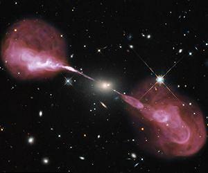 Cosmic microwave radiation points to invisible 'dark matter', marking the spot where jets of material travel at near light speed, according to an international team of astronomers. Lead author Rupert Allison of Oxford University presented their results yesterday (6 July) at the National Astronomy Meeting in Venue Cymru, Llandudno, Wales. Currently, no one knows for sure what dark matter is made of, but it accounts for about 26% of the energy content of the Universe, with massive galaxies forming in dense regions of dark matter. Although invisible, dark matter shows up through its gravitational effect - a big blob of dark matter pulls in normal matter (like electrons, protons and neutrons) through its own gravity, eventually packing together to create stars and entire galaxies. Many of the largest of these are 'active' galaxies with supermassive black holes in their cores. Some of the gas falling towards the black holes is ejected out as jets of particles and radiation. Observations made with radio telescopes show that these jets often stretch for millions of light years from their host galaxy - far larger in extent than the galaxy itself. Scientists therefore expected that the jets would live in regions where there was an excess, higher-than-average concentration of dark matter. But since dark matter is invisible, testing this idea is not straightforward. Einstein's general theory of relativity describes how light feels the effect of gravitational fields, giving away the presence of dark matter through an effect known as 'gravitational lensing'. Observing how dark matter distorts light allows astronomers to deduce its location and measure its mass. The Universe also has an ideal reference map - the Cosmic Microwave Background (CMB) - covering the entire sky. This is a relic of the formation of the cosmos, and is a 'snapshot' of the universe as it was just 400,000 years after the Big Bang. The light from this epoch has taken more than 13 billion years to reach us. Light coming from this very early time travels through most of the universe unimpeded. The lumpy dark matter, however, exerts a small gravitational tug on the light, deflecting it slightly from a straight-line path, rather like a lens does in a pair of glasses. By analysing subtle distortions in the CMB, the team of Mr Allison, Dr Sam Lindsay (Oxford) and Dr Blake Sherwin (UC Berkeley) were able to locate dense regions of dark matter. As suspected, this is where the powerful radio jets are more common - a deep-lying correlation between the most massive galaxies today and the afterglow of the Big Bang. Mr Allison commented: "Without dark matter, big galaxies wouldn't have formed and supermassive black holes wouldn't exist. And without black holes, we wouldn't see intergalactic jets. So we have found another signature of how dark matter shapes today's universe." The scientists now hope to use new instruments to improve their measurements and more clearly understand how radio jets and their host galaxies change over the history of the Universe. Future telescopes such as Advanced ACTPol and the Square Kilometre Array will provide the complementary data to make this hope a reality.