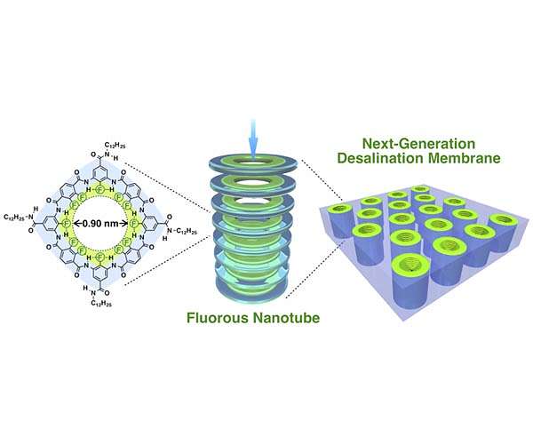 Water scarcity is a growing problem around the world. Desalination of seawater is an established method to produce drinkable water but comes with huge energy costs. For the first time, researchers use fluorine-based nanostructures to successfully filter salt from water. Compared to current desalination methods, these fluorous nanochannels work faster, require less pressure and less energy, and are a more effective filter. If you've ever cooked with a nonstick Teflon-coated frying pan, then you've probably seen the way that wet ingredients slide around it easily. This happens because the key component of Teflon is fluorine, a lightweight element that is naturally water repelling, or hydrophobic. Teflon can also be used to line pipes to improve the flow of water. Such behavior caught the attention of Associate Professor Yoshimitsu Itoh from the Department of Chemistry and Biotechnology at the University of Tokyo and his team. It inspired them to explore how pipes or channels made from fluorine might operate on a very different scale, the nanoscale. "We were curious to see how effective a fluorous nanochannel might be at selectively filtering different compounds, in particular, water and salt. And, after running some complex computer simulations, we decided it was worth the time and effort to create a working sample," said Itoh. "There are two main ways to desalinate water currently: thermally, using heat to evaporate seawater so it condenses as pure water, or by reverse osmosis, which uses pressure to force water through a membrane that blocks salt. Both methods require a lot of energy, but our tests suggest fluorous nanochannels require little energy, and have other benefits too." The team created test filtration membranes by chemically synthesizing nanoscopic fluorine rings, which were stacked and embedded in an otherwise impermeable lipid layer, similar to the organic molecules that make up cell walls. They created several test samples with nanorings between about 1 and 2 nanometers. For reference, a human hair is almost 100,000 nanometers wide. To test the effectiveness of their membranes, Itoh and the team measured the presence of chlorine ions, one of the major components of salt - the other being sodium - on either side of the test membrane. "It was very exciting to see the results firsthand. The smaller of our test channels perfectly rejected incoming salt molecules, and the larger channels too were still an improvement over other desalination techniques and even cutting-edge carbon nanotube filters," said Itoh. "The real surprise to me was how fast the process occurred. Our sample worked around several thousand times faster than typical industrial devices, and around 2,400 times faster than experimental carbon nanotube-based desalination devices." As fluorine is electrically negative, it repels negative ions such as the chlorine found in salt. But an added bonus of this negativity is that it also breaks down what are known as water clusters, essentially loosely bound groups of water molecules, so that they pass through the channels quicker. The team's fluorine-based water desalination membranes are more effective, faster, require less energy to operate and are made to be very simple to use as well, so what's the catch? "At present, the way we synthesize our materials is relatively energy-intensive itself; however, this is something we hope to improve upon in upcoming research. And, given the longevity of the membranes and their low operational costs, the overall energy costs will be much lower than with current methods," said Itoh. "Other steps we wish to take are of course scaling this up. Our test samples were single nanochannels, but with the help of other specialists, we hope to create a membrane around 1 meter across in several years. In parallel with these manufacturing concerns, we're also exploring whether similar membranes could be used to reduce carbon dioxide or other undesirable waste products released by industry."