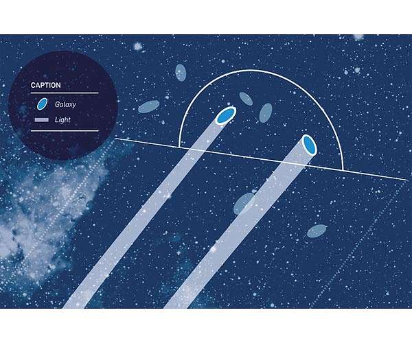 Two methods for determining the structure of matter The Kilo-Degree Survey team, as well as several other groups, determined the density and structure of matter using the gravitational lensing effect: as high-mass objects deflect light from galaxies, these galaxies appear in a distorted form in a different location than they actually are when viewed from Earth. Based on these distortions, cosmologists can deduce the mass of the deflecting objects and thus the total mass of the Universe. In order to do so, however, they need to know the distances between the light source, the deflecting object and the observer, among other things. The researchers determine these distances with the help of redshift, which means that the light of distant galaxies arrives on Earth shifted into the red range.