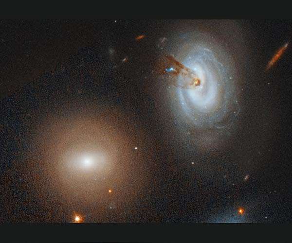 A new study led by Yale University astronomers tells the story of a galaxy that ran out of gas. It's a story as old as the universe itself: A galaxy is born, brimming with new stars, its spiral arms stretching and curving. But then it runs into trouble, veering too close to the center of a nearby galaxy cluster. The surrounding cluster begins to siphon off the galaxy's star-making gas, until it loses its spiral arms and becomes a dead relic. That's what happened to a galaxy called D100 in the massive, Coma galaxy cluster, starting roughly 300 million years ago. Images from NASA's Hubble Space Telescope allowed researchers to see the phenomenon in unprecedented detail. "This galaxy stands out as a particularly extreme example of processes common in massive clusters, where a galaxy goes from being a healthy spiral full of star formation to a 'red and dead' galaxy. The spiral arms disappear and the galaxy is left with no gas and only old stars," said Yale graduate student William Cramer, who led the new research. "This phenomenon has been known about for several decades, but Hubble provides the best imagery of galaxies undergoing this process." The process, called "ram pressure stripping," occurs when a galaxy falls toward the dense center of a massive cluster of thousands of galaxies. During its plunge, the galaxy plows through intra-cluster material that is even more dense. This material pushes gas and dust - star-making fuel - away from the galaxy. Once the galaxy loses all of its gas, it meets an untimely death because it can no longer create new stars. In the Coma cluster, this violent gas-loss process occurs in many galaxies. But D100 is unique, note the scientists. Its long, thin tail, for example, extends nearly 200,000 light-years - about the length of two Milky Way galaxies. In addition, the tail is narrow, only 7,000 light-years wide. "The dust tail is remarkably well-defined, straight, and smooth, and has clear edges," said Yale astronomer Jeffrey Kenney, a co-author of the study. "This is a surprise because a tail like this is not seen in most computer simulations. Most galaxies undergoing this process are more of a mess. The clean edges and filamentary structures of the dust tail suggest that magnetic fields play a prominent role in shaping the tail. Computer simulations show that magnetic fields form filaments in the tail's gas. With no magnetic fields, the gas tail is more clumpy than filamentary." The Subaru Telescope in Hawaii uncovered the long, glowing hydrogen tail in 2007 during a survey of Coma cluster galaxies. But astronomers needed Hubble observations to confirm the hot gas was a signature of star formation. "Without the depth and resolution of Hubble, it's hard to say if the glowing hydrogen gas emission is coming from stars in the tail or if it's just from the gas being heated," Cramer said. The researchers' main goal was to study star formation in the tail, which was fueled by D100's ongoing gas loss. However, Hubble did not find as many stars as the team expected, based on the amount of glowing hydrogen gas contained in the tail. The brightest clump of young stars in the middle of the tail contains at least 200,000 stars. The Hubble data shows that the gas-stripping process began on the outskirts of D100 and is moving in towards the center. Based on the images, the gas has been cleared out all the way down to the galaxy's central region. Another image reveals D100's eventual fate. It's an image of galaxy D99, which underwent the same violent gas loss that D100 is now undergoing. All of D99's gas was siphoned between 500 million and 1 billion years ago, and its spiral structure has mostly faded away. "D100 will look like D99 in a few hundred million years," Kenney said. The Coma cluster is located 330 million light-years from Earth.