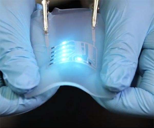 Researchers in China have made a new hybrid conductive material - part elastic polymer, part liquid metal - that can be bent and stretched at will. Circuits made with this material can take most two-dimensional shapes and are also non-toxic. The work appears June 14 in the new interdisciplinary journal iScience. "These are the first flexible electronics that are at once highly conductive and stretchable, fully biocompatible, and able to be fabricated conveniently across size scales with micro-feature precision," says senior author Xingyu Jiang, a professor at the National Center for Nanoscience and Technology. "We believe that they will have broad applications for both wearable electronics and implantable devices." The material that the researchers fashioned is called a metal-polymer conductor (MPC), so called because it is a combination of two components with very different yet equally desirable properties. The metals in this case are not familiar conductive solids, such as copper, silver, or gold, but rather gallium and indium, which exist as thick, syrupy liquids that still permit electricity to flow. The researchers found that embedding globs of this liquid metal mixture within a supporting network of silicone-based polymer yielded mechanically resilient materials with enough conductivity to support functioning circuits. Up close, the structure of the MPC can be likened to round liquid metal islands floating in a sea of polymer, with a liquid metal mantle underneath to ensure full conductivity. The researchers successfully tried out different MPC formulations in a variety of applications, including in sensors for wearable keyboard gloves and as electrodes for stimulating the passage of DNA through the membranes of live cells. 0 "The applications of the MPC depend on the polymers," says first author Lixue Tang, a graduate student in Jiang's research group. "We cast super-elastic polymers to make MPCs for stretchable circuits. We use biocompatible and biodegradable polymers when we want MPCs for implantable devices. In the future, we could even build soft robots by combining electroactive polymers." In principle, the authors state that their method for manufacturing MPCs, which involves screen printing and microfluidic patterning, can accommodate any two-dimensional geometry, as well as different thicknesses and electrical properties, depending on the concentrations of the liquid metal inks to be sprayed. This versatility could lead directly to desirable biomedical applications, such as flexible patches for identifying and mitigating heart disease. "We wanted to develop biocompatible materials that could be used to build wearable or implantable devices for diagnosing and treating disease without compromising quality of life, and we believe that this is a first step toward changing the way that cardiovascular diseases and other afflictions are managed," says Jiang.