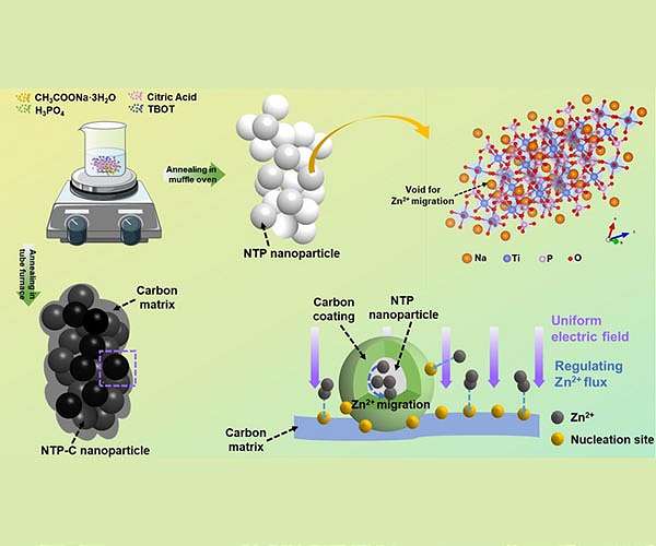 "Aqueous ZIBs hold great potential as competitive candidates for next-generation energy storage devices," said corresponding author Ying Bai, professor at School of Materials Science and Engineering in Beijing Institute of Technology. "Thanks to their high theoretical capacity, low cost, and high security." Bai explained that among various anode materials, the direct adoption of Zn anode could lead to highly competitive gravimetric and volumetric capacities (820 mAh g-1 and 5855 mAh cm-3) as well as suitable redox potential (-0.762 V versus standard hydrogen). Although metallic Zn anode has such advantages, it is still suffering from many challenges, including Zn dendrite generation and side reactions (hydrogen evolution, Zn corrosion and passivation). These issues bring about unstable cycling performance with low Coulombic efficiency (CE), capacity fading, and even short-circuit when the dendrite punctures the separator, which limit the further development of ZIBs and impede their practical applications. Accordingly, it is crucial to develop high-performance metallic Zn anode. To modify metallic Zn electrodes, Bai said a great number of strategies have been proposed, such as anode structure design, alloying with other metals, electrolyte optimization, and building artificial protective layer. Owing to effective performance enhancement, possibility in large-scale manufacturing, tunability and designability of physical and chemical properties, constructing protective coating has arisen widespread interest. Bai and her team overviewed the advances of constructing artificial layer to stabilize Zn anode according to the protection mechanisms. First, porous materials like nano-CaCO3, Kaolin, Zn-based montmorillonite, and MOF-based materials can regulate Zn2+ flux for stable cycling by the selective channels and pores. While the carbon-based materials, including reduced graphene oxide (rGO), porous carbon, and mesoporous hollow carbon, improve the cyclability of ZIBs via increasing the Zn deposition sites, regulating electric field distribution and reducing local current density. Apart from the inorganic protective layers, polyamide with unique hydrogen-bonding network and coordination with metal ions, polymer Glue, ZnF2 and S/N-rich organic compounds etc were also developed to stabilize Zn anode and prolong the lifespans, but the introduced polymer components may result in increased polarization and nucleation overpotential. Therefore, according to Bai, there is still great room for developing functional protective layers for stable Zn anode. "Taking account of Zn dendrites are caused by non-uniform metal deposition, involving uneven electric fields and Zn2+ ion flux," Bai said. "Combining two mechanisms and constructing a NaTi2(PO4)3 with carbon coating (NTP-C) protective layer onto the surface of Zn metal anode can regulate Zn deposition behavior for stable aqueous ZIBs. Since the carbon coated NTP particles are imbedded in the carbon matrix, the protective layer can not only increase the Zn deposition sites for homogeneous nucleation, and uniform electric field for reduced local current density, but also regulate the distribution of Zn2+ flux simultaneously. In such way, the generation of Zn dendrites and side reactions can be suppressed." "NTP-C protective layer provides an isolation function between water and Zn and NTP-C@Zn exhibits the highest corrosion potential (-0.987?V vs. Ag/AgCl) compared with bare Zn and NTP@Zn electrodes." Bai said. "The artificial layer can suppress corrosion and protect Zn anode from side reactions to achieve stable cycling among all the three kinds of electrodes." "By combining the advantages of NTP and carbon, NTP-C achieves dual Zn deposition layers and further prolongs the lifespan of symmetrical cell to more than 600?h.". Bai said. "The NTP-C protective layer provides a low nucleation overpotential and plating/stripping polarizations in symmetrical cell as well. The NTP-C@Zn symmetrical cell exhibits a stable cycling performance even at a harsh condition (100 mA cm-2), which enables its application in high-load electrodes and supercapacitors." "Furthermore, the NTP-C coated Zn electrode displays a short nucleation and 2D diffusion period, followed by a 3D diffusion process represented by a stable current density." Bai said. "The constrained 2D diffusion brings about a unaggregated interface, suggesting the adsorbed Zn2+ ions appear to be locally reduced to Zn0 with constrained 2D behavior, which is due to the increased energy barrier for Zn2+ lateral migration and the abundant nucleation sites of the introduced NTP-C coating." This work combines two protective mechanisms and offers a new inspiration for the practical applications of Zn metal anode in ZIBs. Bai said, such strategy could help to develop suitable metallic anode for commercialization. "Although great progress has been achieved, the development of Zn anodes for ZIBs is still facing massive challenges, such as investigating the electrochemical performance at large deposition areal capacity and high degree of discharge." Bai said. "In practical application, Zn anode is often matched to a cathode with a high mass loading of active materials, and the capacity ratio between theses electrodes in the battery cell need to be carefully adjusted to achieve a high energy density, long cycle life battery cell. In general, there are still practical issues that need to be paid more attention to investigate." Other contributors include Jingjing Yang, Ran Zhao, Yahui Wang, and Chuan Wu, School of Materials Science and Engineering, Beijing Institute of Technology.