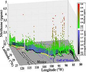 After taking a rented camper outfitted with special equipment to measure methane on a cross-continent drive, a UC Santa Barbara scientist has found that methane emissions across large parts of the U.S. are higher than currently known, confirming what other more local studies have found. Their research is published in the journal Atmospheric Environment. Methane is a potent greenhouse gas, stronger than carbon dioxide on a 20-year timescale, according to the Intergovernmental Panel on Climate Change, though on a century timescale, carbon dioxide is far stronger. "This research suggests significant benefits to slowing climate change could result from reducing industrial methane emissions in parallel with efforts on carbon dioxide," said Ira Leifer, a researcher with UCSB's Marine Science Institute. Leifer was joined by two UCSB undergraduate students on the road trip from Los Angeles to Florida, taking a primarily southern route through Arizona, New Mexico, Texas, Louisiana, and along the Gulf of Mexico. They used specialized instrumentation, a gas chromatograph, to measure methane. The device was mounted in the RV, with an air ram on the roof that collected air samples from in front of the vehicle. "We tried to pass through urban areas during nighttime hours, to avoid being stuck in traffic and sampling mostly exhaust fumes," Leifer said. "Someone was always monitoring the chromatograph, and when we would see a strong signal, we would look to see what potential sources were in the area, and modify the survey to investigate and, if possible, circumnavigate potential sources." The researchers meandered slowly through areas of fossil fuel activity, such as petroleum and natural gas production, refining, and distribution areas, and other areas of interest. The wide range of sources studied included a coal-loading terminal, a wildfire, and wetlands. The team analyzed the data in conjunction with researchers at the University of Bremen, Germany, who analyzed inventories and satellite data from the Scanning Imaging Absorption Spectrometer for Atmospheric Chartography (SCIAMACHY) instrument onboard the European Space Agency's (ESA) ENVISAT satellite to confirm the finding of strong methane sources in regions of fossil fuel activity. The surface measurements found methane levels increased as the researchers moved toward Houston, and then decreased as they continued westward -- the same trend observed in satellite data spanning the continent. Previous methane studies have focused primarily on large-scale airborne data, which were challenging to separate from local sources, according to Leifer. In fact, clear identification of individual sources often could not be conducted, requiring computer models and other surface measurements. The team compared maps of estimated methane emissions based on data from the International Energy Agency of the U.S. Department of Energy with satellite methane maps. They found that, in some cases, to explain observed higher methane concentrations required higher emissions than current emission maps present, particularly in large regions of fossil fuel industrial activity. In other cases, though, they could rule out that wetlands such as swamps may have been important. In such cases, separating wetland methane contributions from fossil fuel industrial contributions was not possible with their approach, Leifer said, "This is a topic we are investigating further through new research," he added. "Methane is the strongest human greenhouse gas on a political or short timescale, and also has more bang for the buck in terms of addressing climate change," said Leifer. "This research supports other recent findings suggesting that fugitive emissions from fossil fuel industrial activity actually are the largest methane source. This clearly indicates a need for efforts to focus on reducing these methane emissions." The researchers found the highest methane concentrations in areas with significant refinery activity, and in California in a Central Valley region of oil and gas production. Methane levels near refineries were not uniform, varying greatly from spot to spot and at different times. Nighttime concentrations were dramatically enhanced when the winds died down, forming a calm, shallow atmospheric layer near the surface, according to Leifer. Perhaps the most surprising discovery was made in the Los Angeles area, where the study highlighted the importance of geologic methane emissions in the North Los Angeles Basin, centered on the La Brea Tar Pits. Rough estimation of emissions from the data suggests 10-20 percent of the methane emissions from Los Angeles could be natural geologic, influenced by the vast number of abandoned wells throughout the area. This study was supported by a National Science Foundation Rapid Response Grant, by NASA and ESA, as well as JAXA, the Japanese Space Agency. Support also came from the Department of Energy, through the Gulf of Mexico Hydrates Research Consortium, the University of Mississippi, the University of Bremen, and the German Aerospace Center (DLR) Space Administration. According to Leifer, these results illustrate the need for satellite technology to further this type of research and also to provide guidance to decision makers. "We are working with methane data from the Japanese satellite, GOSAT, to continue these investigations," Leifer said. "We look forward to when new tools, like ESA's CarbonSat and NASA's HyspIRI spacecraft, are in orbit to help, as well as results from a new joint NASA/ESA airborne campaign, COMEX, with University of Bremen researchers to improve further methane satellite designs." COMEX will test different airborne remote sensing technologies for application to methane observations.