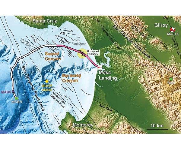 Fiber-optic cables that constitute a global undersea telecommunications network could one day help scientists study offshore earthquakes and the geologic structures hidden deep beneath the ocean surface. In a paper appearing this week in the journal Science, researchers from the University of California, Berkeley, Lawrence Berkeley National Laboratory (Berkeley Lab), Monterey Bay Aquarium Research Institute (MBARI) and Rice University describe an experiment that turned 20 kilometers of undersea fiber-optic cable into the equivalent of 10,000 seismic stations along the ocean floor. During their four-day experiment in Monterey Bay, they recorded a 3.5 magnitude quake and seismic scattering from underwater fault zones. Their technique, which they had previously tested with fiber-optic cables on land, could provide much-needed data on quakes that occur under the sea, where few seismic stations exist, leaving 70% of Earth's surface without earthquake detectors. "There is a huge need for seafloor seismology. Any instrumentation you get out into the ocean, even if it is only for the first 50 kilometers from shore, will be very useful," said Nate Lindsey, a UC Berkeley graduate student and lead author of the paper. Lindsey and Jonathan Ajo-Franklin, a geophysics professor at Rice University in Houston and a visiting faculty scientist at Berkeley Lab, led the experiment with the assistance of Craig Dawe of MBARI, which owns the fiber-optic cable. The cable stretches 52 kilometers offshore to the first seismic station ever placed on the floor of the Pacific Ocean, put there 17 years ago by MBARI and Barbara Romanowicz, a UC Berkeley Professor of the Graduate School in the Department of Earth and Planetary Science. A permanent cable to the Monterey Accelerated Research System (MARS) node was laid in 2009, 20 kilometers of which were used in this test while off-line for yearly maintenance in March 2018. "This is really a study on the frontier of seismology, the first time anyone has used offshore fiber-optic cables for looking at these types of oceanographic signals or for imaging fault structures," said Ajo-Franklin. "One of the blank spots in the seismographic network worldwide is in the oceans." The ultimate goal of the researchers' efforts, he said, is to use the dense fiber-optic networks around the world - probably more than 10 million kilometers in all, on both land and under the sea - as sensitive measures of Earth's movement, allowing earthquake monitoring in regions that don't have expensive ground stations like those that dot much of earthquake-prone California and the Pacific Coast. "The existing seismic network tends to have high-precision instruments, but is relatively sparse, whereas this gives you access to a much denser array," said Ajo-Franklin.