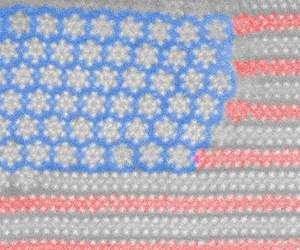 anoflags and Nanoflowers "We wanted to understand the thermal stability of this particular material," Kim said. "We thought it was a good candidate for next-generation nanoelectronics. Out of curiosity, we set out to see whether it would be stable above room temperature." When they increased the temperature to above 450 degrees Celsius, two things happened. "First, we saw a new pattern begin to emerge that was aesthetically pleasing to the eye," Kim said. Across the surface of the sample, the repeating rows, or stripes, of molybdenum ditelluride layers began to transform into shapes that looked like tiny six-pointed stars, or flowers with six petals. The material was transitioning into hexa-molybdenum hexa-telluride, a one-dimensional wire-like structure. The cross section of the new material is a structure consisting of six central atoms of molybdenum surrounded by six atoms of tellurium. As the phase transition progressed, part of the sample was still "stripes" and part had become "stars." The team thought the pattern looked like a United States flag. They made a false-color version with a blue field behind the stars and half of the stripes colored red, to make a "nanoflag."