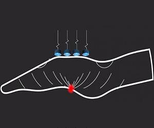 Using your skin as a touchscreen has been brought a step closer after UK scientists successfully created tactile sensations on the palm using ultrasound sent through the hand. The University of Sussex-led study - funded by the Nokia Research Centre and the European Research Council - is the first to find a way for users to feel what they are doing when interacting with displays projected on their hand. This solves one of the biggest challenges for technology companies who see the human body, particularly the hand, as the ideal display extension for the next generation of smartwatches and other smart devices. Current ideas rely on vibrations or pins, which both need contact with the palm to work, interrupting the display. However, this new innovation, called SkinHaptics, sends sensations to the palm from the other side of the hand, leaving the palm free to display the screen. The device uses 'time-reversal' processing to send ultrasound waves through the hand. This technique is effectively like ripples in water but in reverse - the waves become more targeted as they travel through the hand, ending at a precise point on the palm. It draws on a rapidly growing field of technology called haptics, which is the science of applying touch sensation and control to interaction with computers and technology. Professor Sriram Subramanian, who leads the research team at the University of Sussex, says that technologies will inevitably need to engage other senses, such as touch, as we enter what designers are calling an 'eye-free' age of technology. He says: "Wearables are already big business and will only get bigger. But as we wear technology more, it gets smaller and we look at it less, and therefore multisensory capabilities become much more important. "If you imagine you are on your bike and want to change the volume control on your smartwatch, the interaction space on the watch is very small. So companies are looking at how to extend this space to the hand of the user. "What we offer people is the ability to feel their actions when they are interacting with the hand." Professor Sriram Subramanian is a Professor of Informatics at the University of Sussex where he leads the Interact Lab and is a member of the Creative Technology Group. The findings were presented at the IEEE Haptics Symposium 2016 in Philadelphia, USA, by the study's co-author Dr Daniel Spelmezan, a research assistant in the Interact Lab. The symposium concludes today (Monday 11 April 2016).